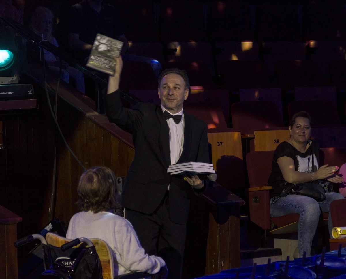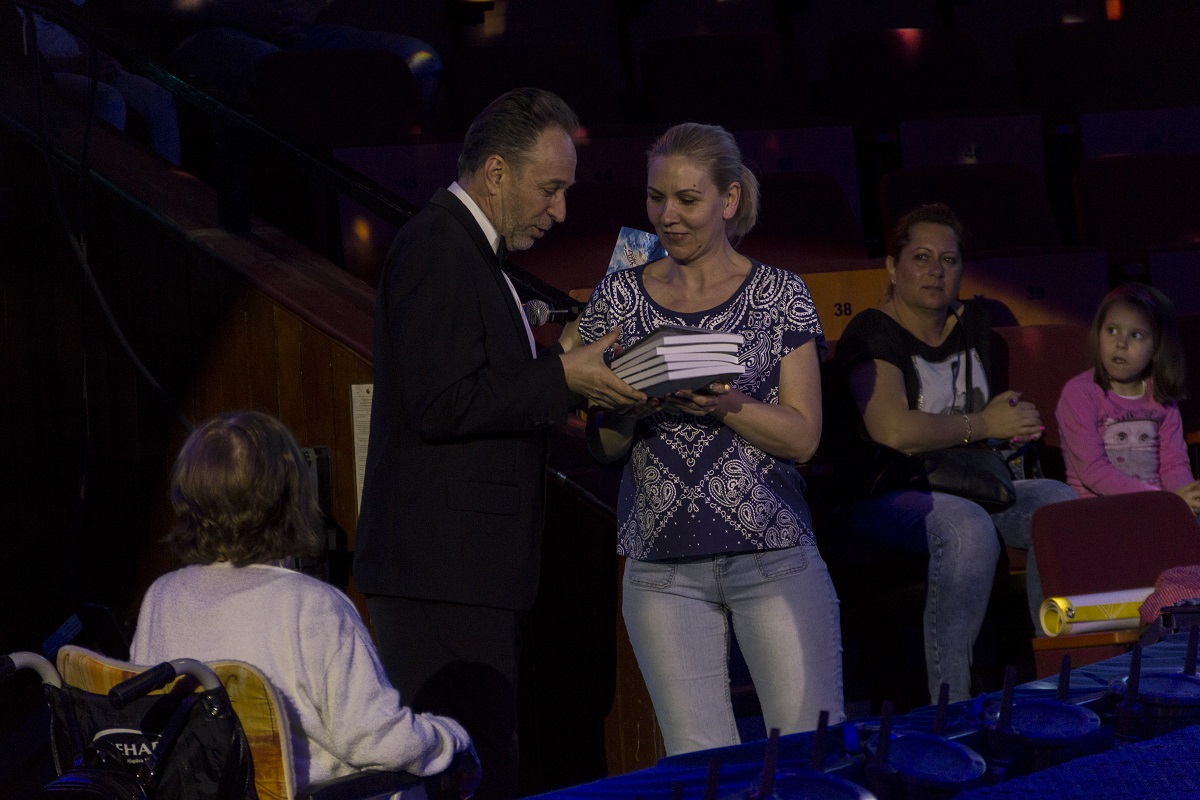 – A holnapi nap folyamán ünnepeljük a vakvezető kutyák világnapját – mondta Fekete Péter – A Fővárosi Nagycirkuszban az elmúlt egy év során elindult a vak és gyengénlátó sorstársaink számára az audio-narrált előadások megtekintése. Ennek kapcsán készült egy nagyon különleges könyv, amelyet Gy. Dobos Mariann írt Közösséget építünk címmel, amely beszámol arról, hogy egy vak és gyengénlátó közönség hogy tudja igénybe venni a különböző kulturális eszközöket, így a Fővárosi Nagycirkusz szolgáltatásait. Most Önök ennek a könyvnek az átadását láthatják. Ezt a könyvet a Fővárosi Nagycirkusz művészei megkapták és a Fővárosi Nagycirkusz könyvtárában elhelyezésre kerül. Köszönjük a szerzőnek, hogy itt van velünk, és köszönjük a Vakok és Gyengénlátók Közép-Magyarországi Regionális Egyesületének elnökasszonyának, hogy elfáradt hozzánk!
