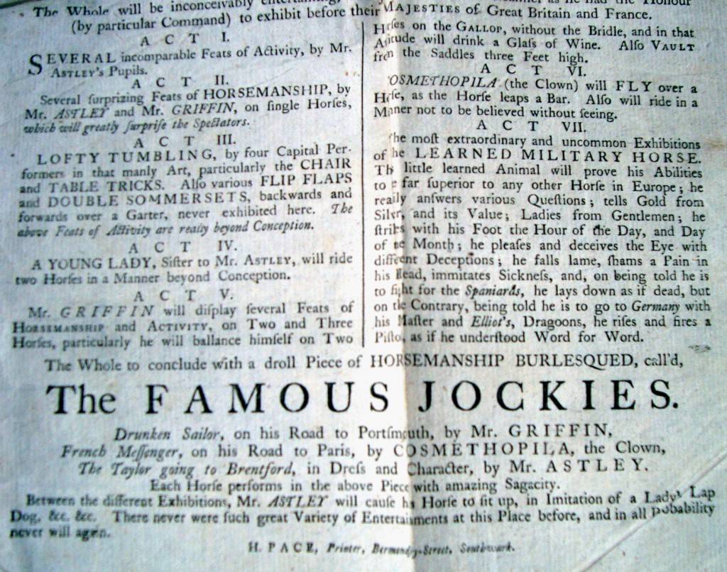 *Astley a saját cirkuszát mindig amfiteátrum névvel illette. Először Astley riválisa, Charles Dibdin nevezte el cirkusznak intézményét (The Royal Circus, 1782).