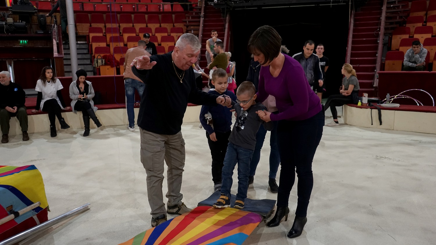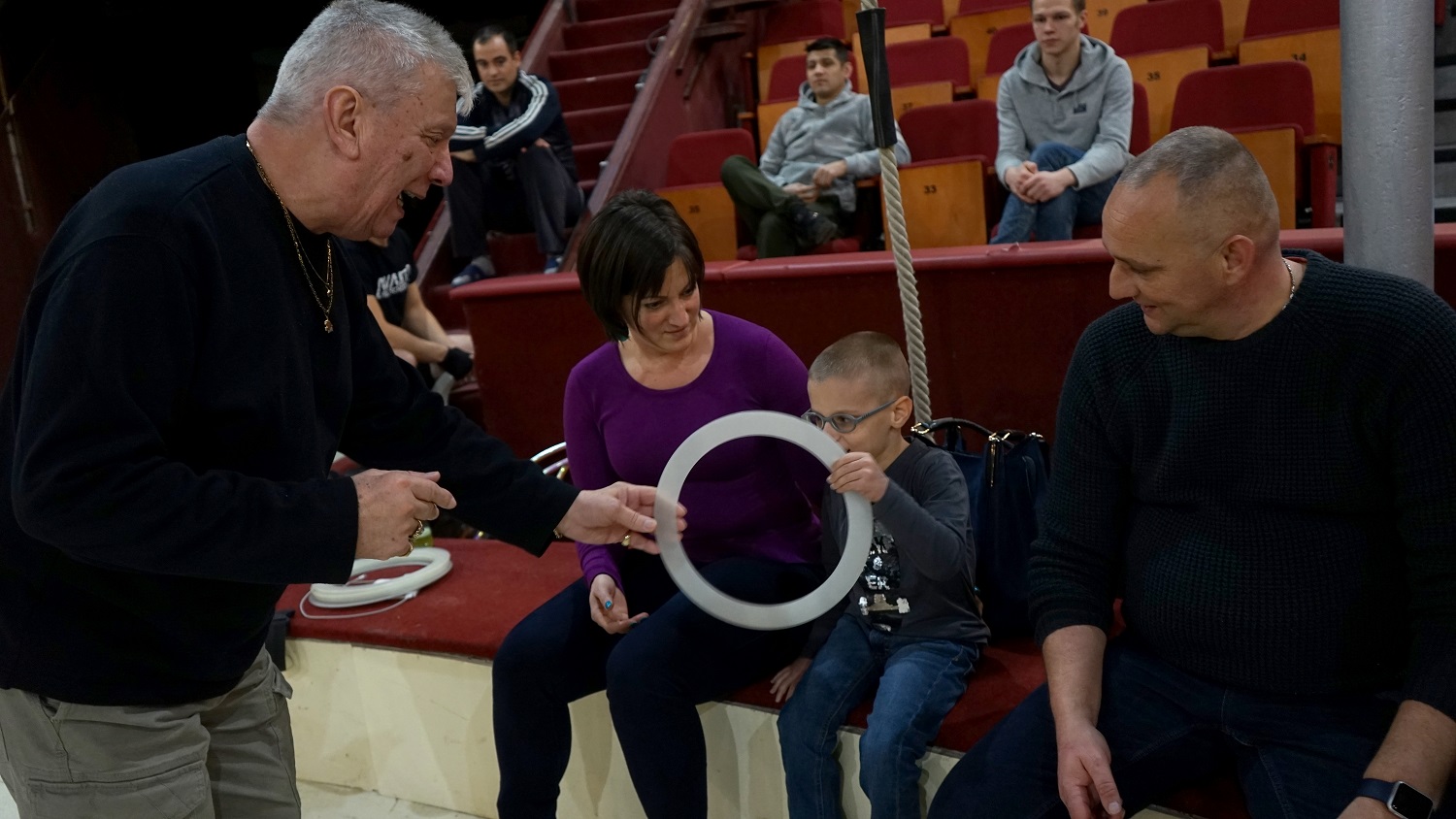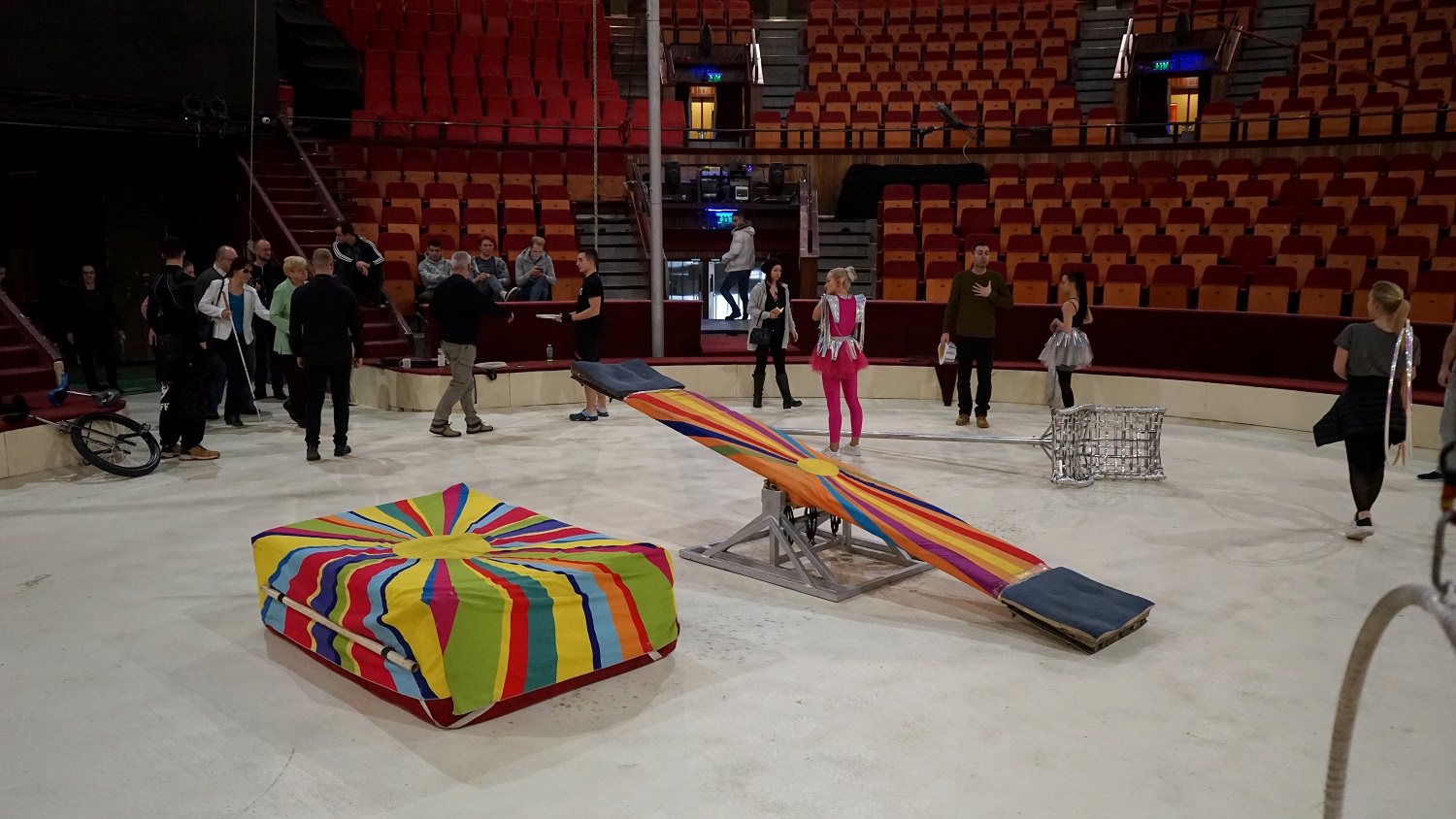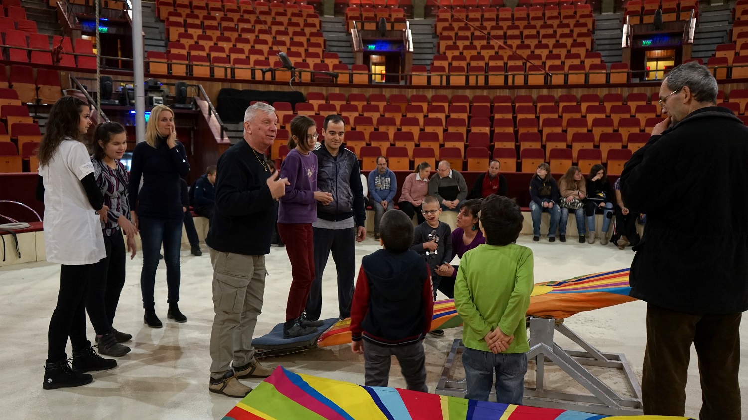 Graeser József bemutatta a tizenhárom méter átmérőjű manézst, amely, hogy ellássa az ízületkímélő funkcióját is, futópályához hasonló anyagból készült. A legbátrabbak felügyelet mellett kipróbálhatták a magasba emelkedés élményét a levegő-karikákon és a Troupe Aliev tagjainak segítségével a deszka számukban használt ugródeszkát. Az előadásban használt rekvizitek működésének és használatának részletes szemléltetése után Tatjana Pelekh állatszelidítő egyik kedves masztiff kutyusát vezette körbe a manézs szélén helyet foglaló vendégeink előtt, aki a simogatásokat puszikkal hálálta meg.