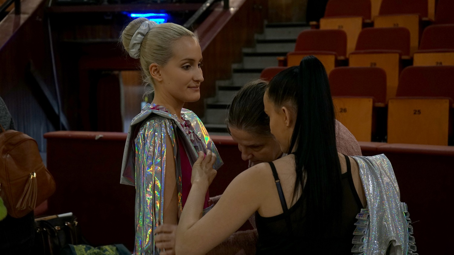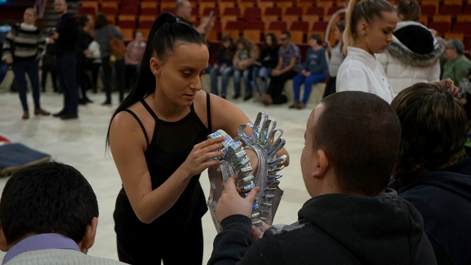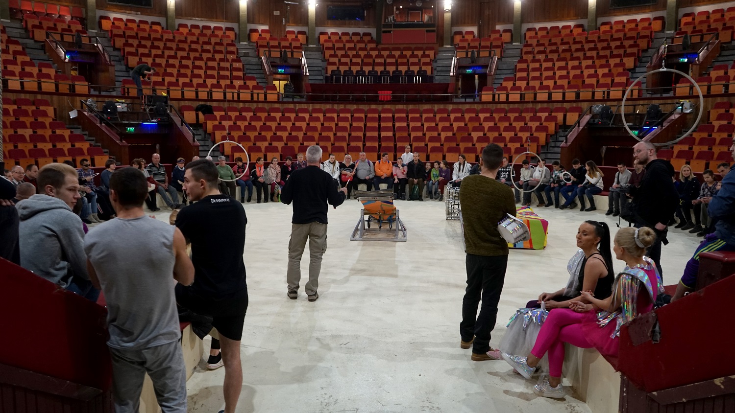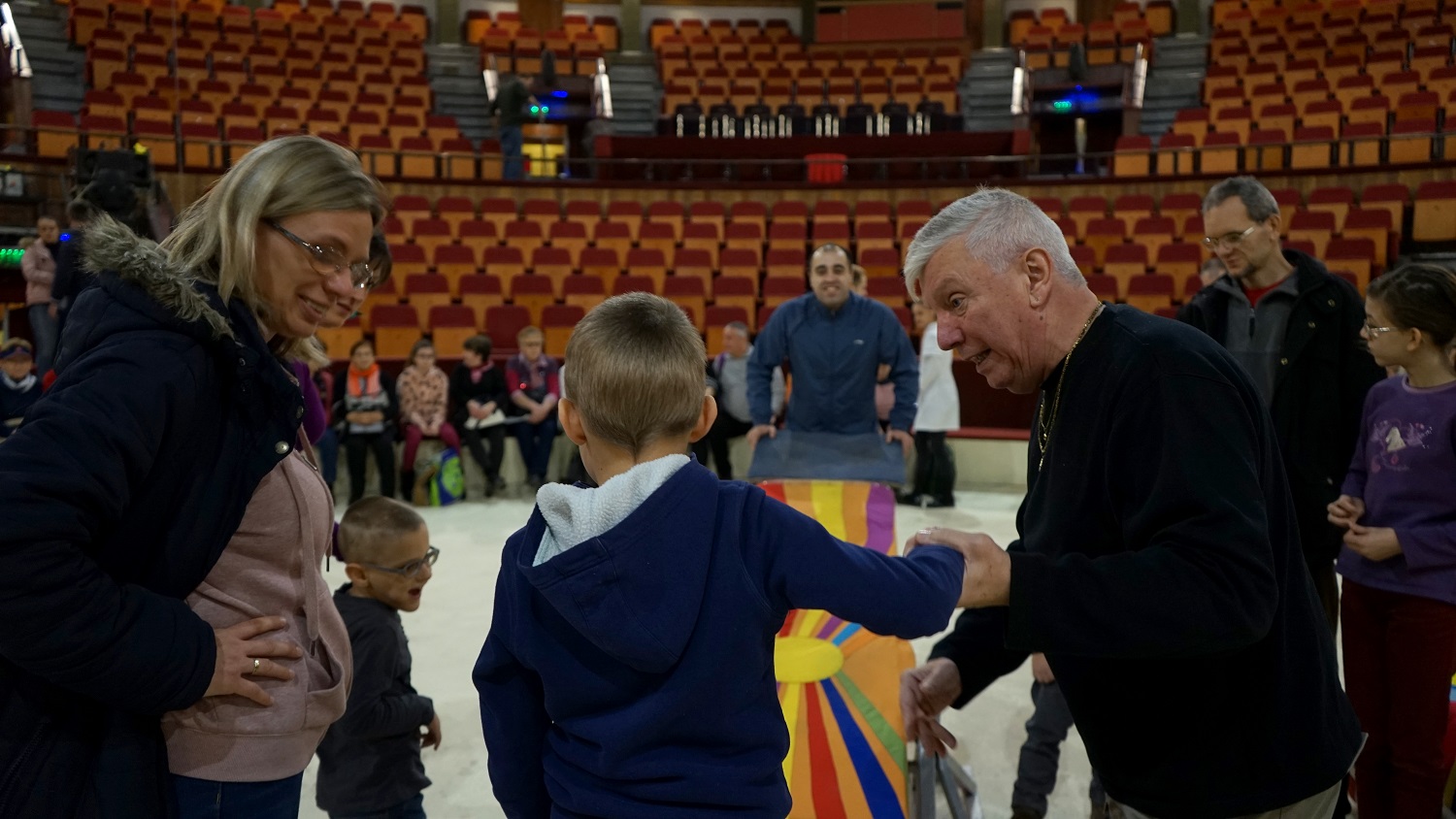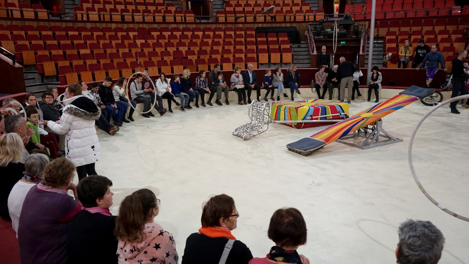 Graeser József bemutatta a tizenhárom méter átmérőjű manézst, amely, hogy ellássa az ízületkímélő funkcióját is, futópályához hasonló anyagból készült. A legbátrabbak felügyelet mellett kipróbálhatták a magasba emelkedés élményét a levegő-karikákon és a Troupe Aliev tagjainak segítségével a deszka számukban használt ugródeszkát. Az előadásban használt rekvizitek működésének és használatának részletes szemléltetése után Tatjana Pelekh állatszelidítő egyik kedves masztiff kutyusát vezette körbe a manézs szélén helyet foglaló vendégeink előtt, aki a simogatásokat puszikkal hálálta meg.