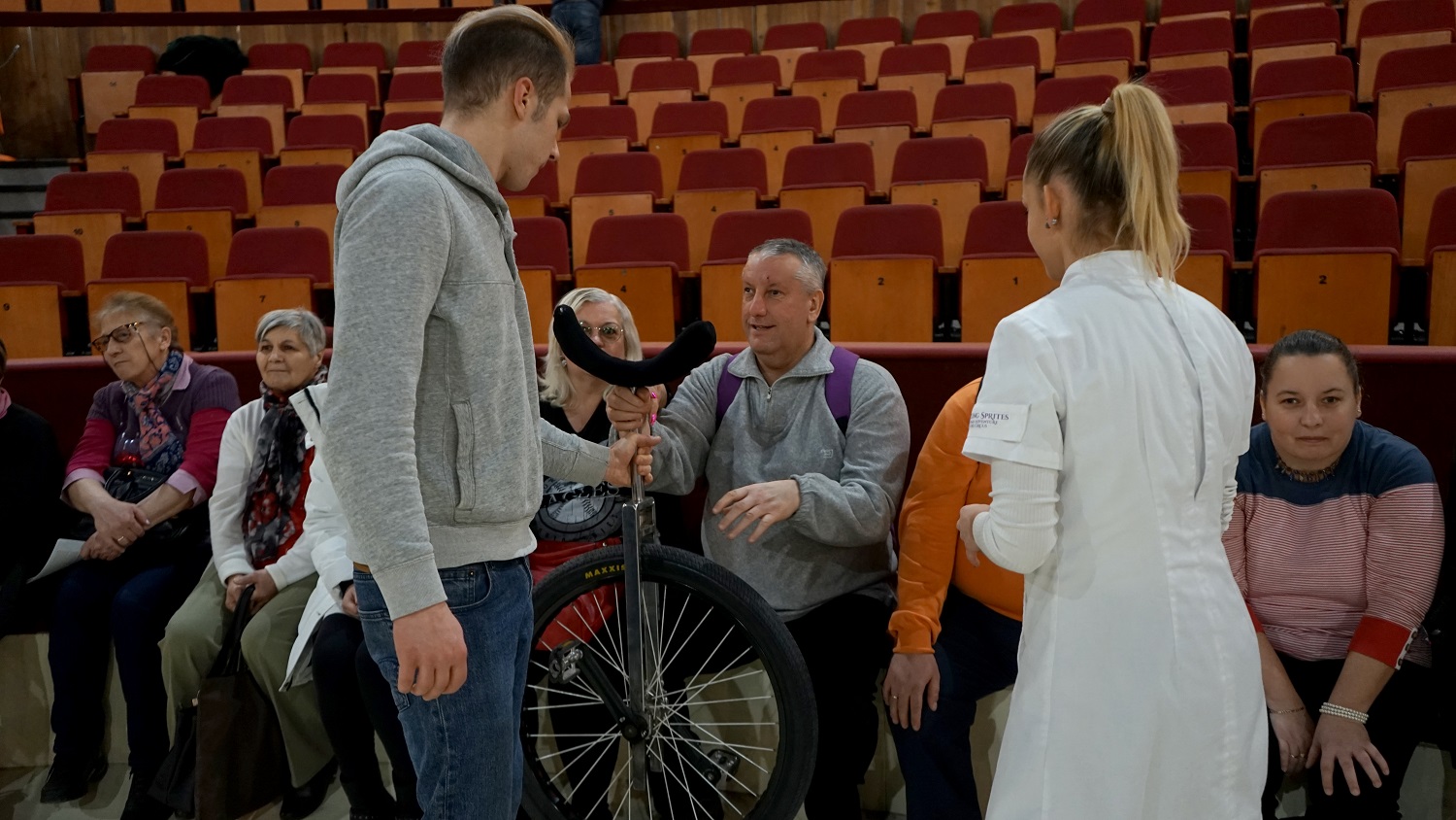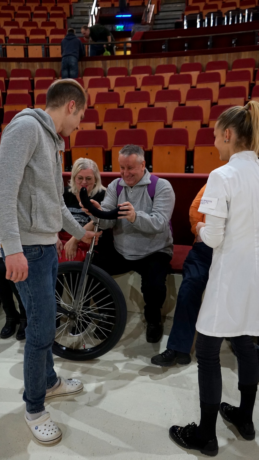 A Vakok és Gyengénlátók Közép-magyarországi Regionális Egyesületétől százötvenen érkeztek, akik családtagjaikkal közösen Graeser József, a Fővárosi Nagycirkusz szakmai vezetőjének segítségével, két csoportra oszolva, taktilis ingerek által megismerkedtek az előadásban szereplő egyik Szikramanóval, a Főmanóval és különleges jelmezeikkel, Danil Lysenko ukrán zsonglőr karikáival, a bohócok tollaslabdaszámhoz használt ütőivel és labdáival és az egykerekű biciklijükkel.