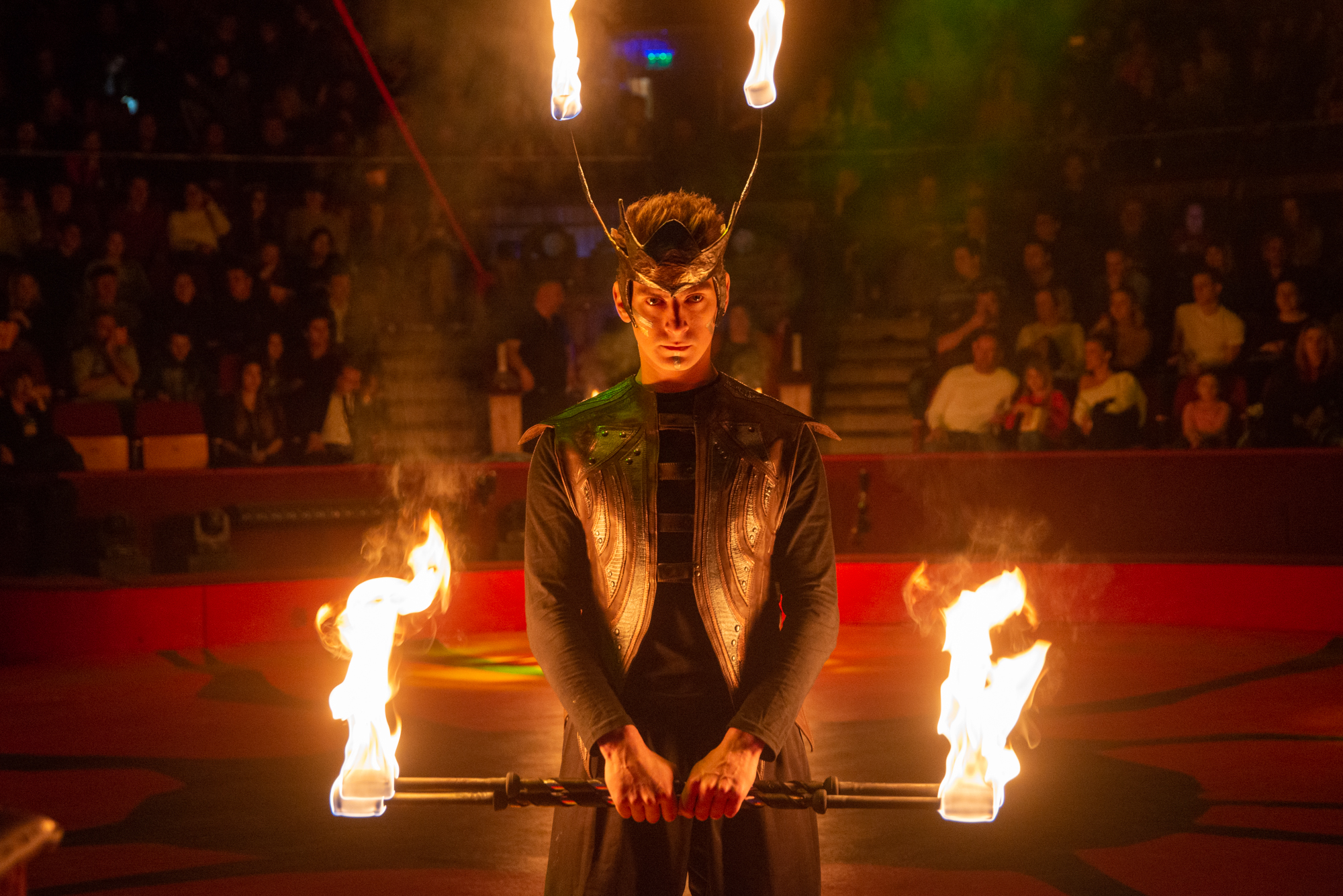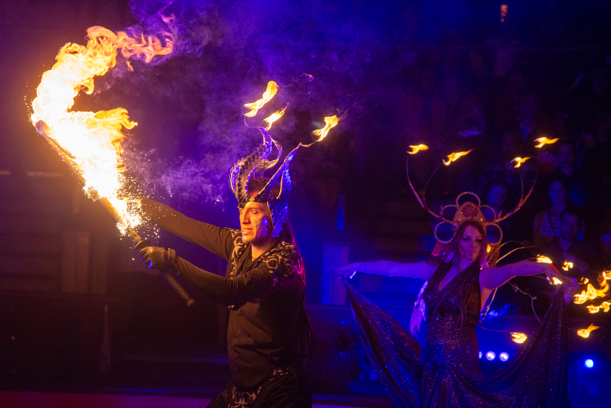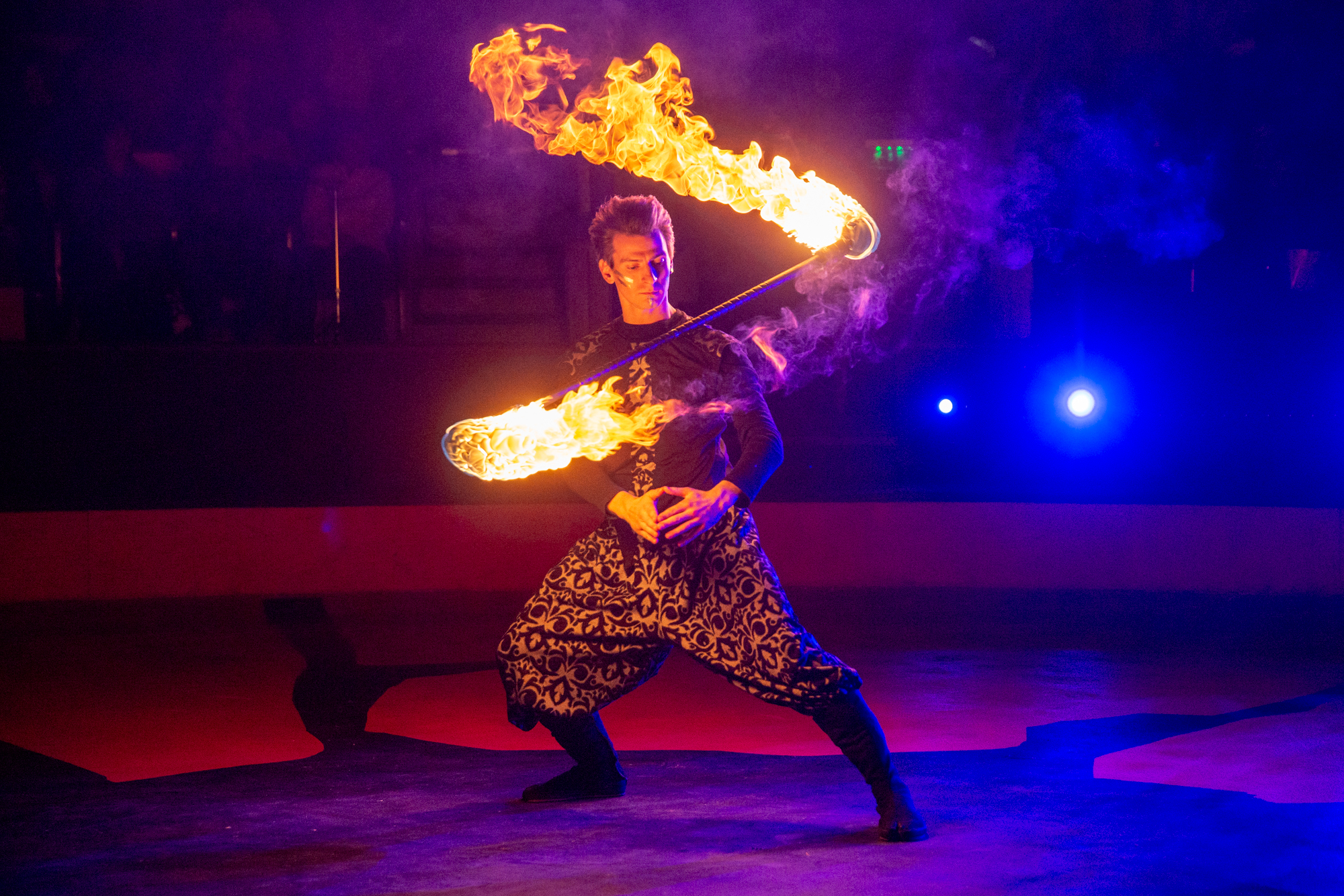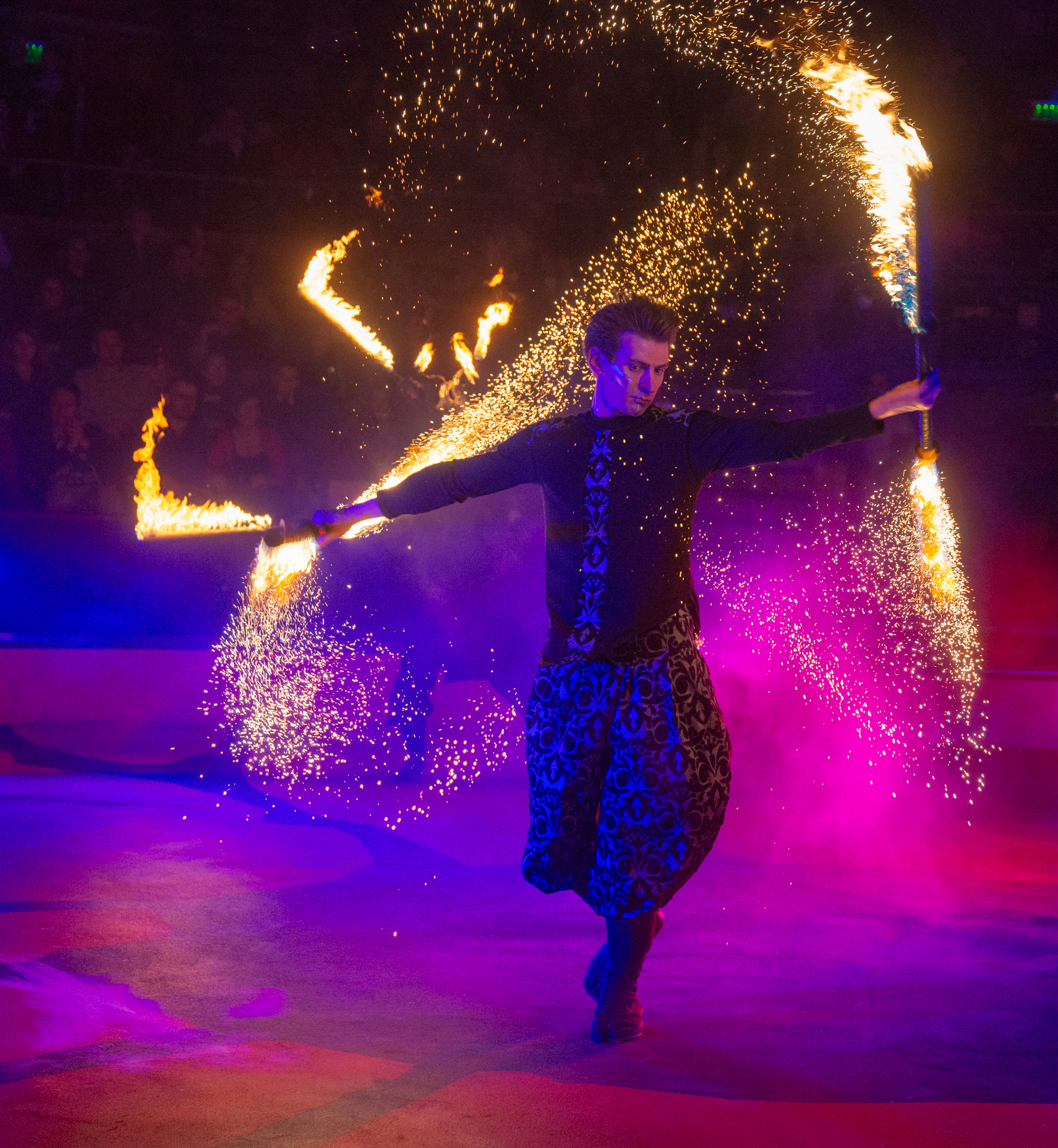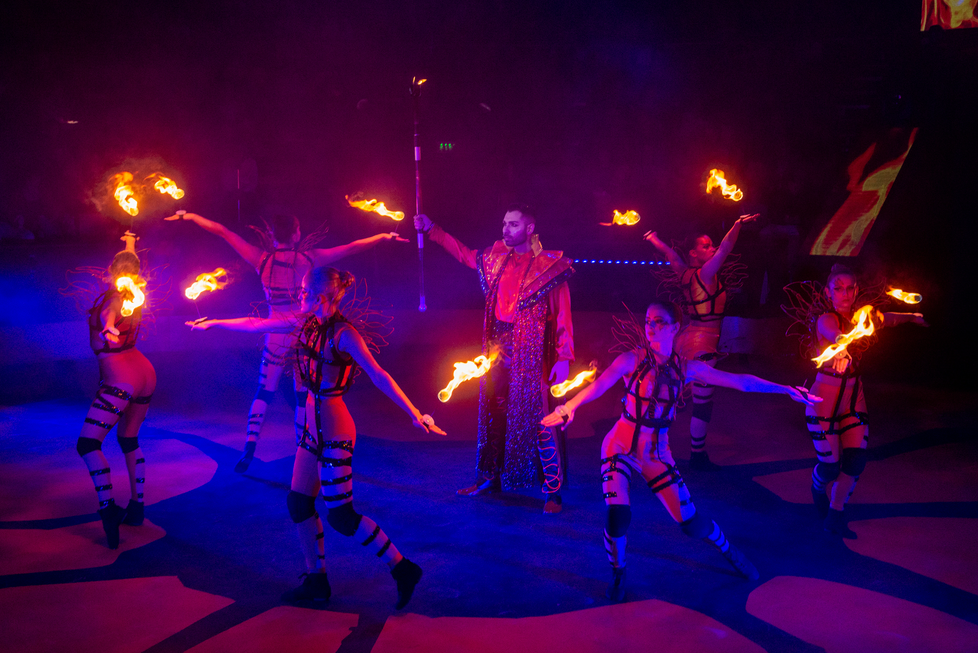 Az előadás első fellépői, az Anima Prizma tűzzsonglőr csoport az emberiség és a tűz ősi kapcsolatát jelenítette meg látványos, többször visszatérő produkcióiban. Felocsúdni sem volt idő az ámulatból, mert máris felbőgött a motor a magasban. Nehéz lenne felsorolni, hogy a Cirque du Soleil világhírű fellépője, ifj. Simet László hány nemzetközi cirkuszfesztiválon aratott sikereket, amelyekkel öregbítette a magyar cirkuszművészet hírnevét, ezért nagy izgalom lett úrrá rajtam, hogy a Fővárosi Nagycirkuszban élőben láthatom, ahogy ferde dróton motorral végigszáguld, miközben Leskó Boglárkával félelmetes trükköket hajt végre. A Tűzvarázsló és a Főnix CD minőségű énekes duettje után Richter Kevin lépett a porondra egzotikus teve és zebra számával, majd a TwirlinGirls – Jerabek Csenge és Faludi Szilvia – pörgette fel a hangulatot görkorcsolya számával. A világbajnok Nagy Molnár Dávid illuzionista bámulatos és humoros műsora után a Rippel Akadémia csupán 10 és 11 éves Tűzangyalai egy profi tissue produkciót mutattak be. Öröm volt látni, hogy ezek a fiatal tehetségek máris példaképként szolgálnak a kortársaik számára. Az Anima Prizma csoport újabb lehengerlő tűztánca után Faludi Szilvia kecses levegő-karika számával varázsolt el, majd a Richter Kevin lovas akrobata-csoport robbant be a manézsba. Richter Kevin tavaly, március 3-án, Magyar Lovas Posta című produkciójával egyszerre húsz lóval lépett fel, amellyel Guinness-rekordot döntött, most pedig lovas akrobata-csoportjával mutatta meg, hogy milyen a kiváló artistaművész felmenőitől eltanult magas szintű lovas akrobatika és magyar virtus, amit a közönség hatalmas ovációval hálált meg. Nagy Molnár Dávid újabb mágikus és misztikus bűvészprodukciója után a Rippel Brothers következett, akik nemcsak a rendezésbe, de FLOW handstand számukba is beletették az artistapályán eltöltött több, mint harminc év tapasztalatát és szakértelmét. Látványos produkciójukban a bizalom, az erő és az egyensúly kapta a főszerepet. Az argentin Diaz-Brothers gaucho-tánca igazi kuriózum a magyar közönség számára, akik látványos és precíz produkcióban varázsolták elénk a dél-amerikai néptáncon alapuló precíz és lendületes mozdulatsorokat. Az izgalmas műsort ifj. Simet László méltán halálkeréknek elnevezett produkciója zárta. Az izgalom a tetőfokára hágott, ahogy a tapasztalt artistaművész a hatalmas, tüzes rekviziten bekötött szemmel, biztosítókötél nélkül egyensúlyozott.