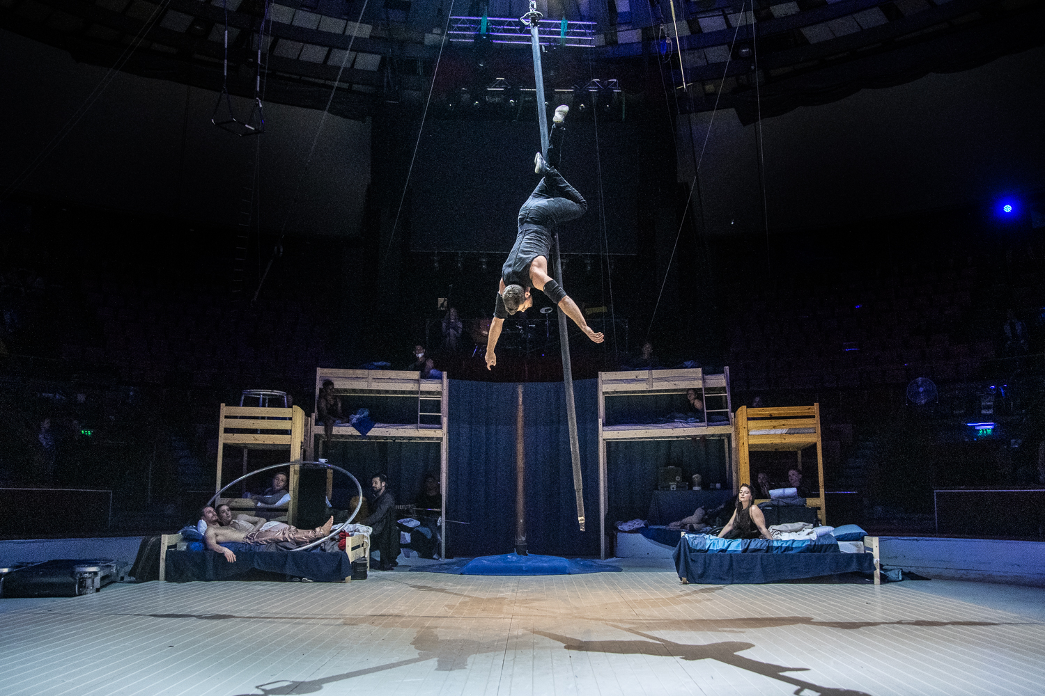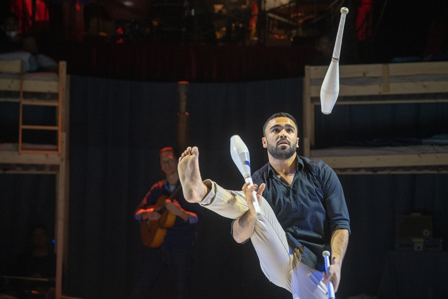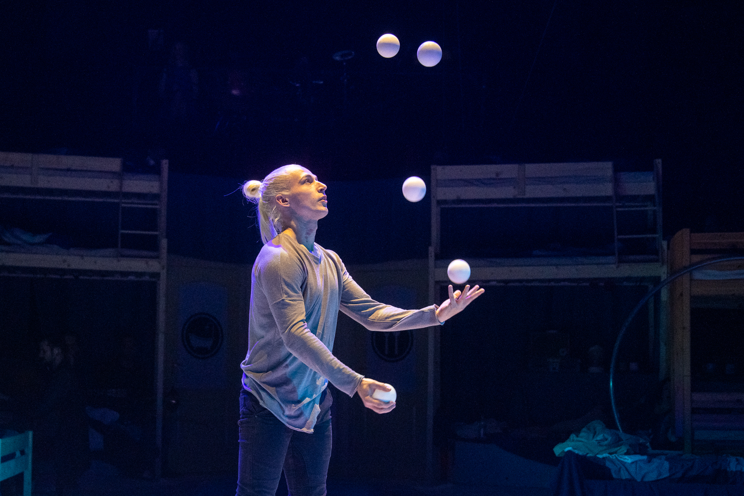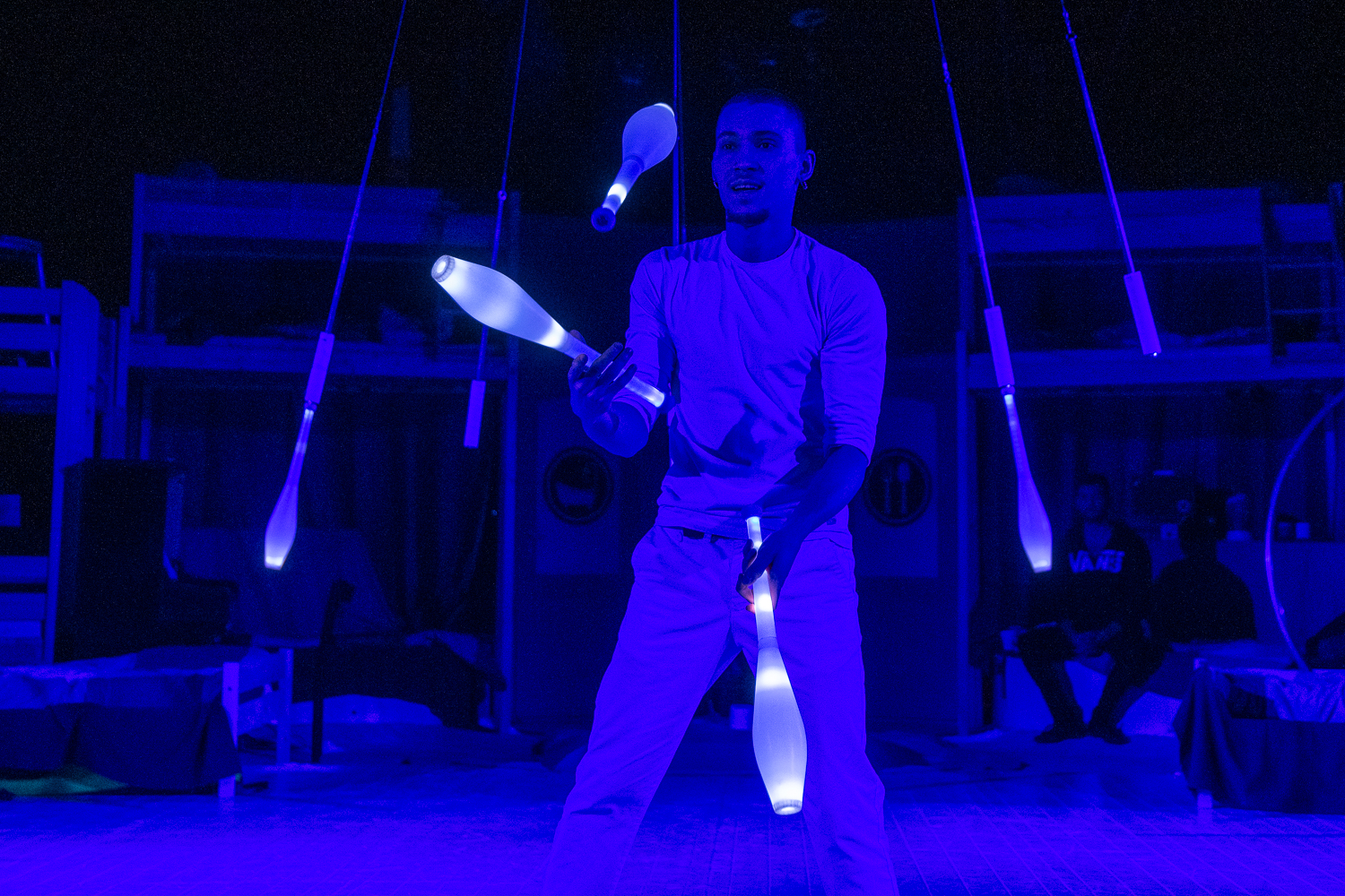Miután mindenki beköltözött a manézsban kialakított hostelbe, az orosz Anton Lozovoi horizontál zsonglőr világító buzogányaival vette kezdetét a csodálatos utazás a cirkuszművészet lenyűgöző világába. Őt az Ukrajnából érkezett Dmytro Bakhtin követte akrobatikus elemekkel tarkított, művészi zsonglőrszámával.