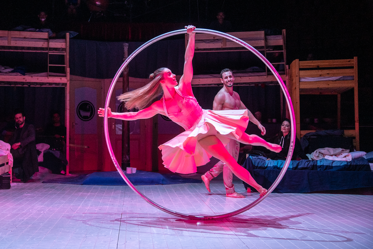 A következő produkció a bizalomról, az összetartozásról és az erőről szólt a svájci-amerikai Nat and Jo lassú mozdulatokkal előadott kötélszámában, amely a közönség körében zajos sikert aratott. „Szerelemtánc a kerékben” címet adtam magamban a kanadai Duo Unity –nek, akik szír kerékszámukban a romantikus kapcsolat változásait és hullámvölgyeit jelenítették meg. Ez a szintén nagy sikert aratott produkció tökéletes példa arra, hogy a cirkuszművészet nem pusztán szórakoztatási forma, hanem gondolatokat, érzéseket megjelenítő és közvetítő művészeti ág.