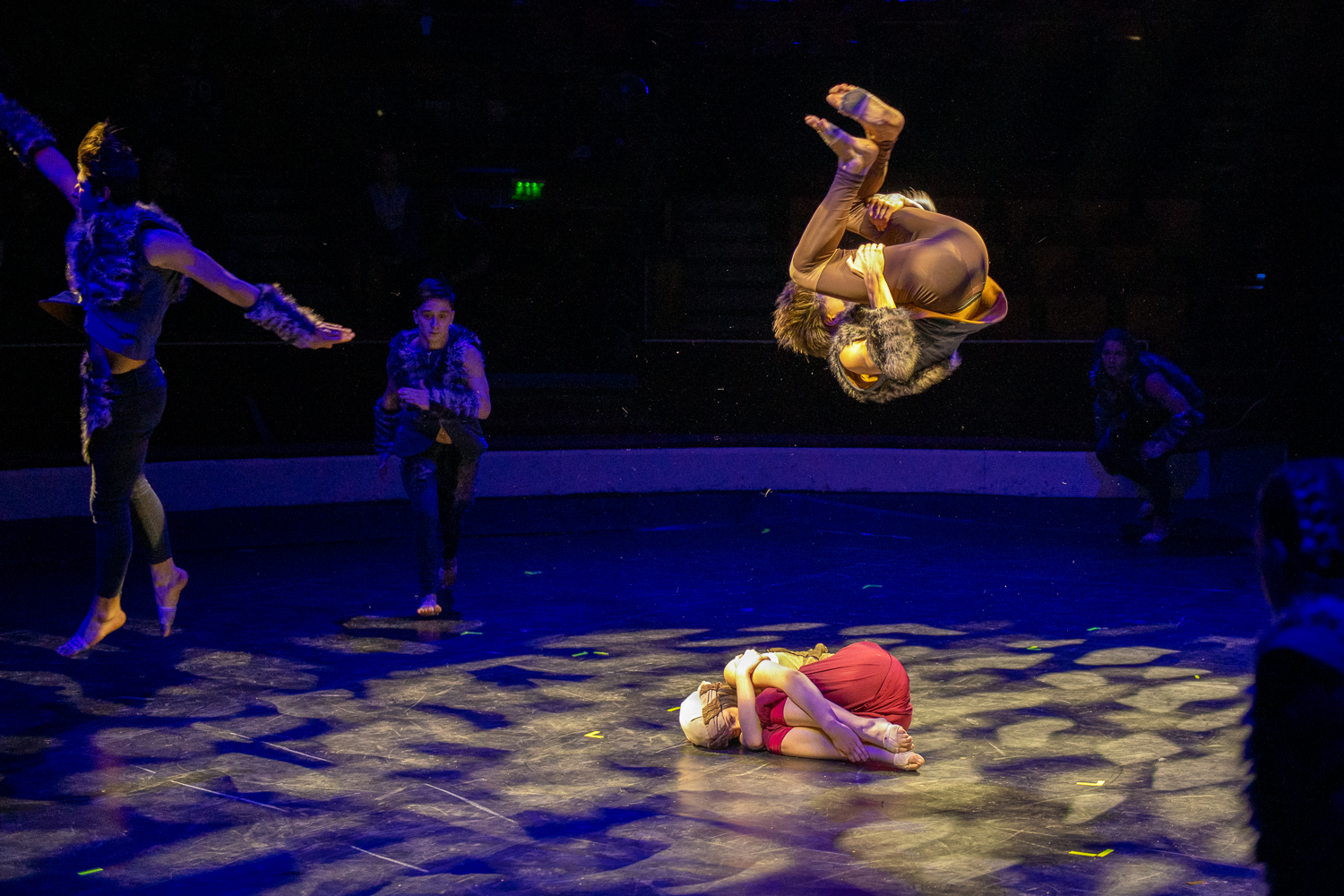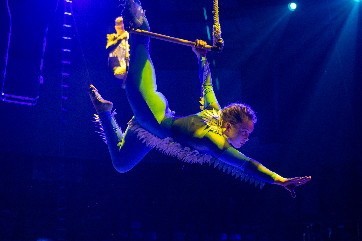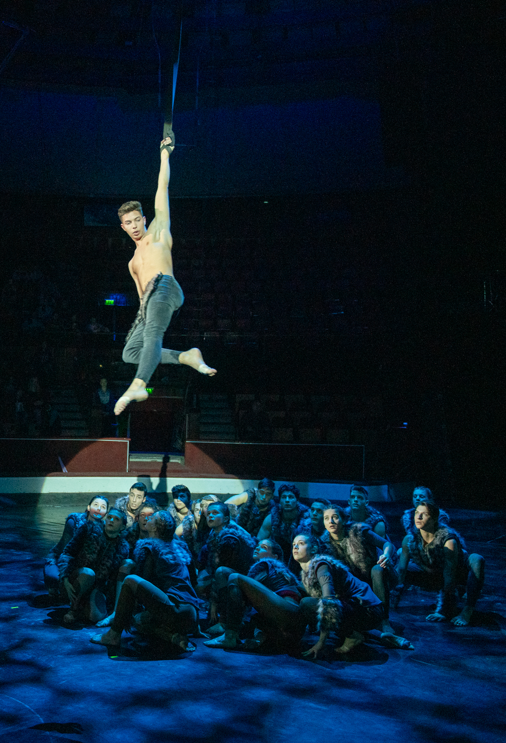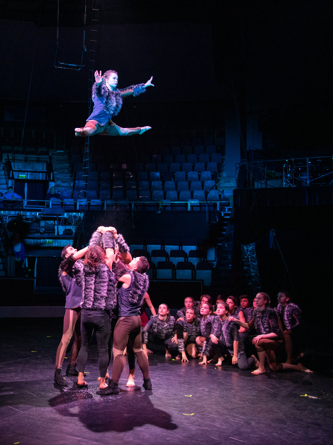 A darab állapot és viszonyváltozásait, valamint a különböző szereplőkre jellemző karakterjegyeket és viselkedésformákat a jól megválasztott zene mellett a fizikai színházi, a mozgásszínházi elemek és a kontakt tánc elemei szöveg nélkül is tökéletesen prezentálják, egyúttal átkötő szerepet is adva a különböző cirkuszművészeti zsánerszámok között. A cirkusz szimbolikája sokféleképpen átültethető és felhasználható. Ez esetben a majmok és a madarak, mint a levegő és a lombkorona lakói hozzájuk illő trapéz, fix sitz, drótkötél számok által jelentek meg, míg a talajon élő farkasok deszkaszám, handstand, partnerakrobatika, talajakrobatika, kínairúd és emelőszám segítségével. Sir Kán sebezhetetlen és mindenkit legázoló karakterének szemléltetéséhez tökéletes eszközként a rönrádot választották az alkotók.