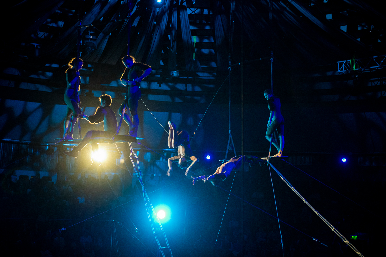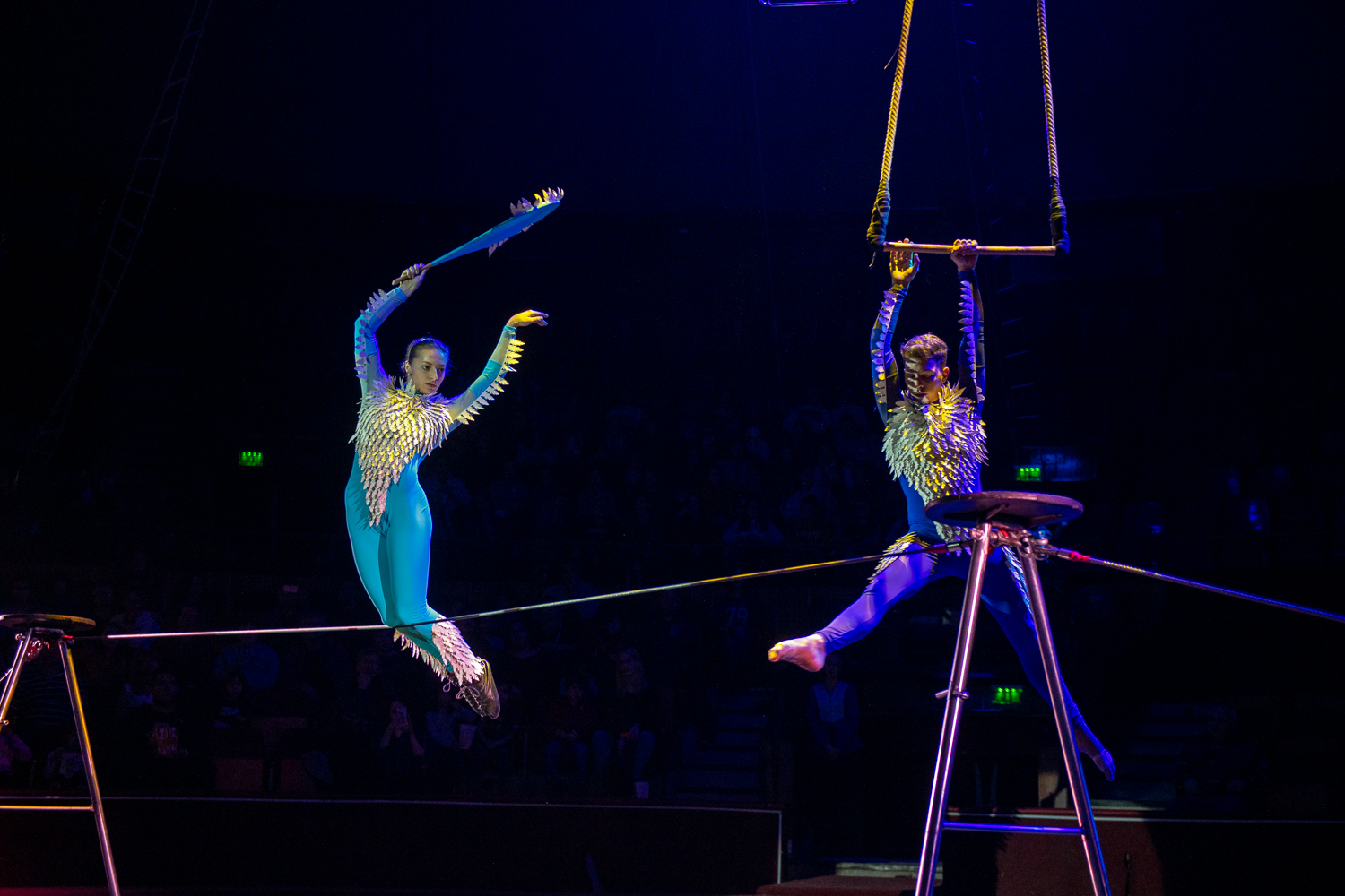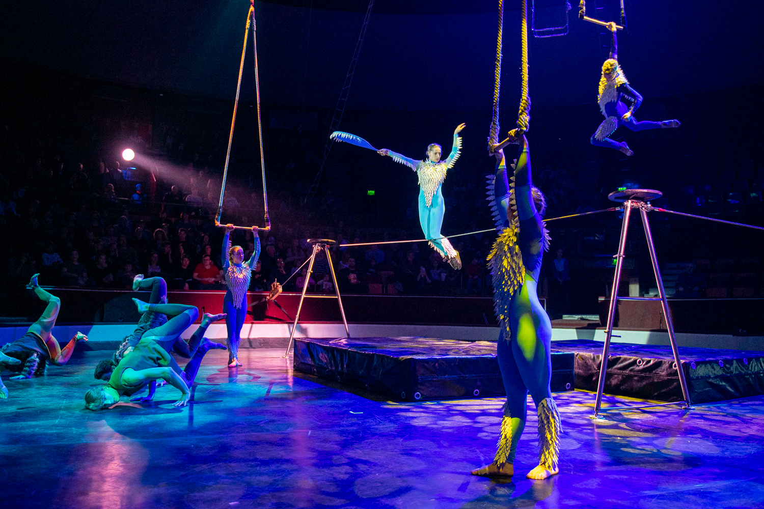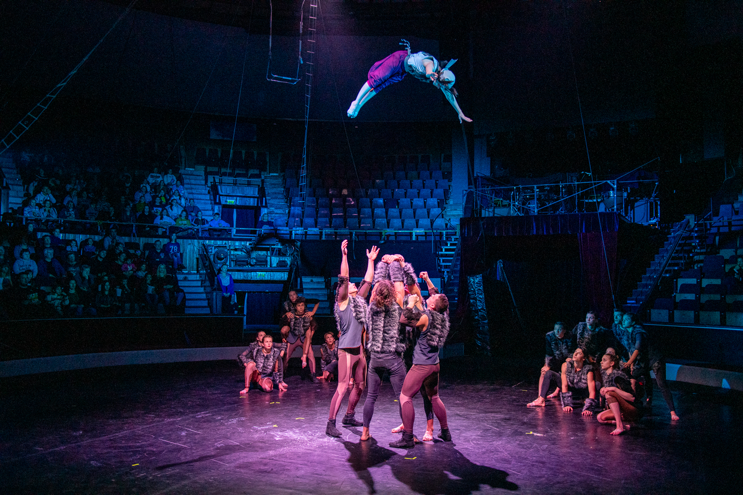 A darab állapot és viszonyváltozásait, valamint a különböző szereplőkre jellemző karakterjegyeket és viselkedésformákat a jól megválasztott zene mellett a fizikai színházi, a mozgásszínházi elemek és a kontakt tánc elemei szöveg nélkül is tökéletesen prezentálják, egyúttal átkötő szerepet is adva a különböző cirkuszművészeti zsánerszámok között. A cirkusz szimbolikája sokféleképpen átültethető és felhasználható. Ez esetben a majmok és a madarak, mint a levegő és a lombkorona lakói hozzájuk illő trapéz, fix sitz, drótkötél számok által jelentek meg, míg a talajon élő farkasok deszkaszám, handstand, partnerakrobatika, talajakrobatika, kínairúd és emelőszám segítségével. Sir Kán sebezhetetlen és mindenkit legázoló karakterének szemléltetéséhez tökéletes eszközként a rönrádot választották az alkotók.