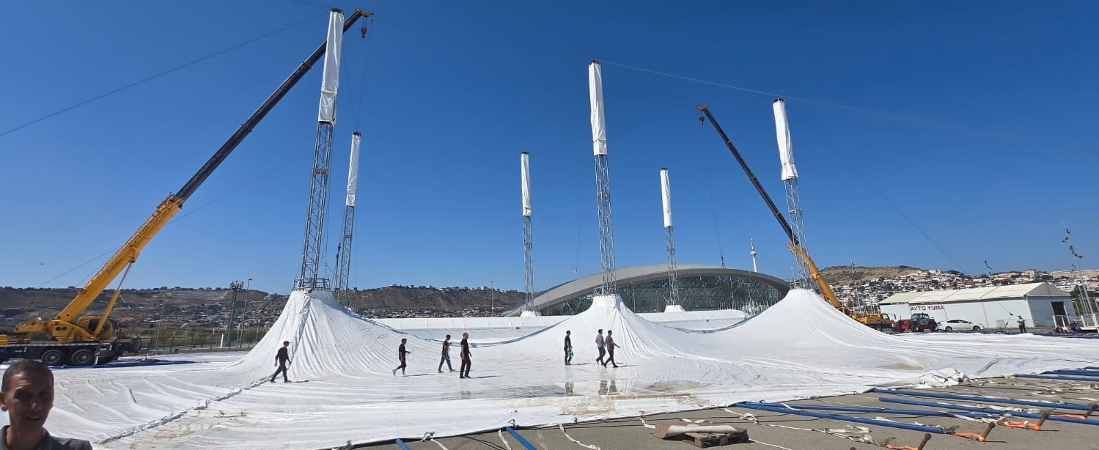 Tizenhat méter magasságban függ a tíz tonna súlyú szerkezet, mely alkalmassá teszi a sátrat, hogy minden cirkuszi produkciót bemutathassanak Bakuban