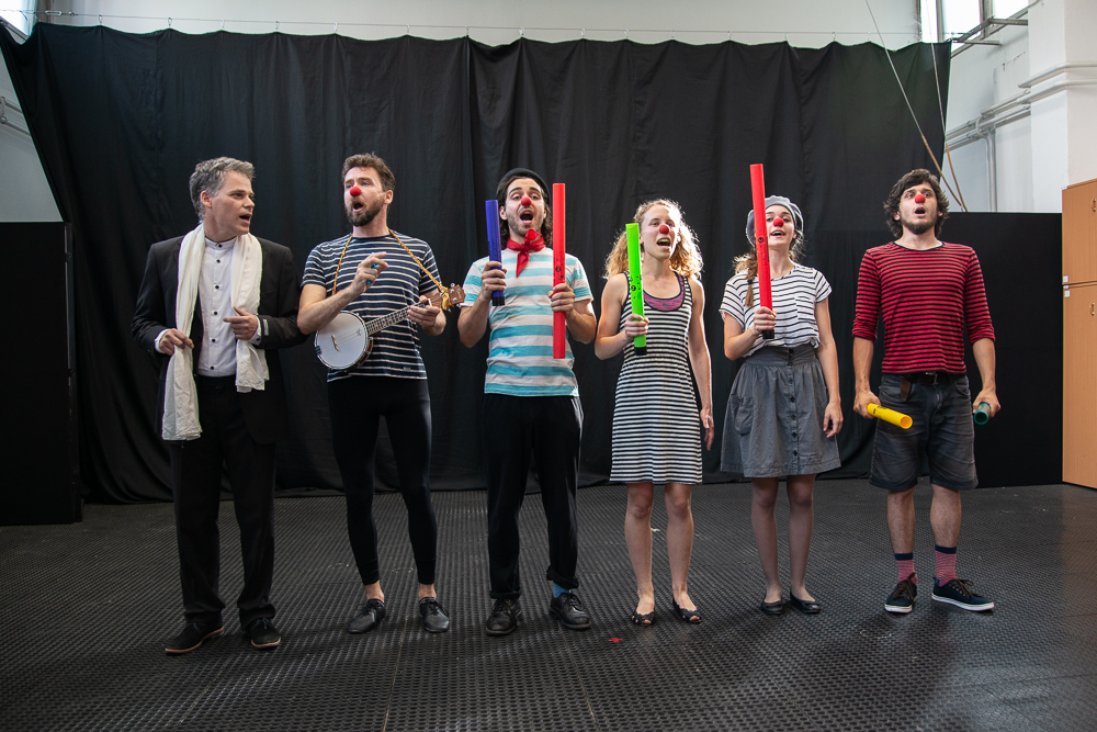 A swing zenére bevonuló, piros orrot viselő hét fős társaság előadásában először ukulelével kísérve felhangzott Csokonay Vitéz Mihály: Tartózkodó kérelem című versének első sorai, majd az Ó te drága Klementina című dalt énekelték el több szólamban, azonnal bizonyosságot adva összművészeti tudásukról. Ez tökéletes felvezetője volt a stand up és pantomim elemeket felsorakoztató Pantomim kommandó harcászati felhasználásáról szóló szkeccsnek.