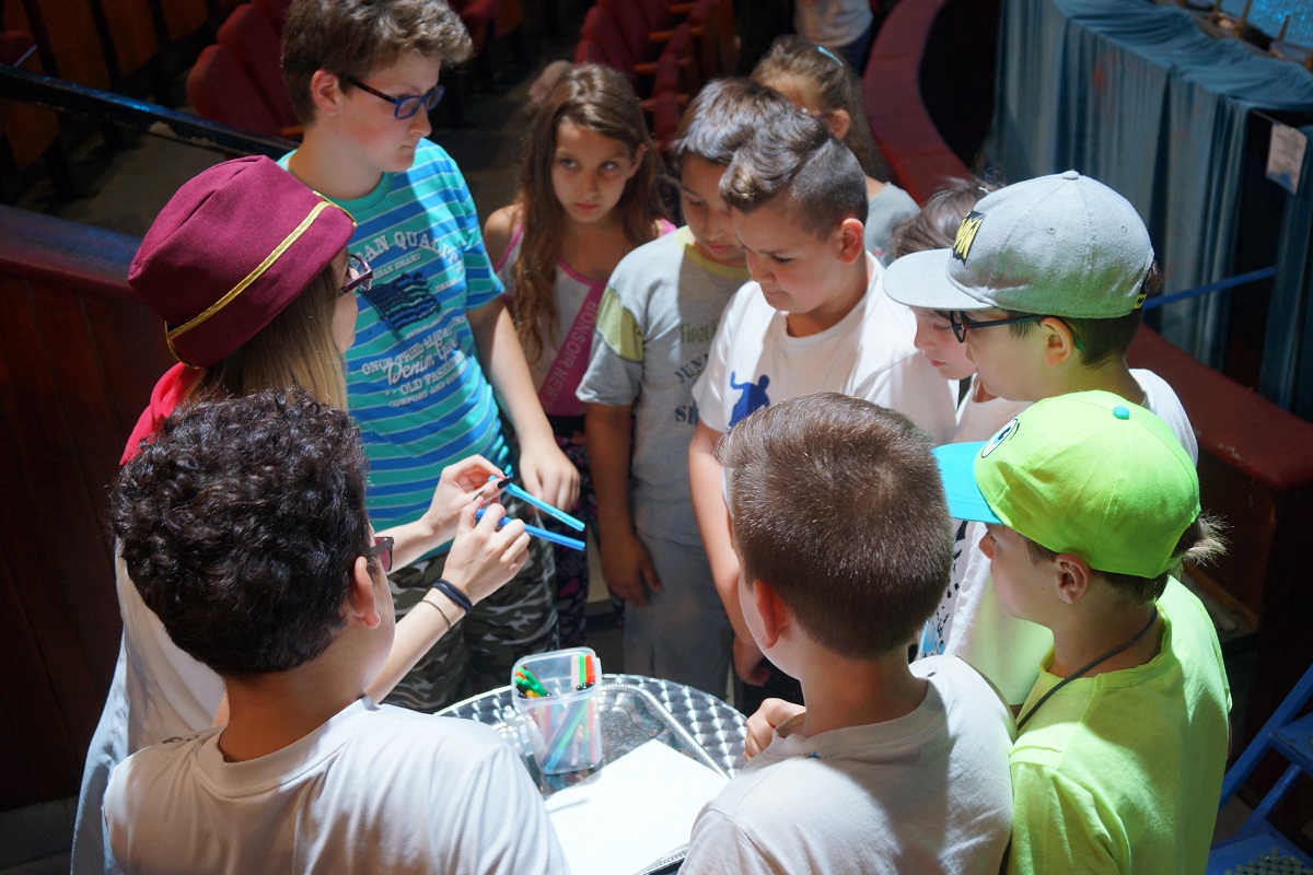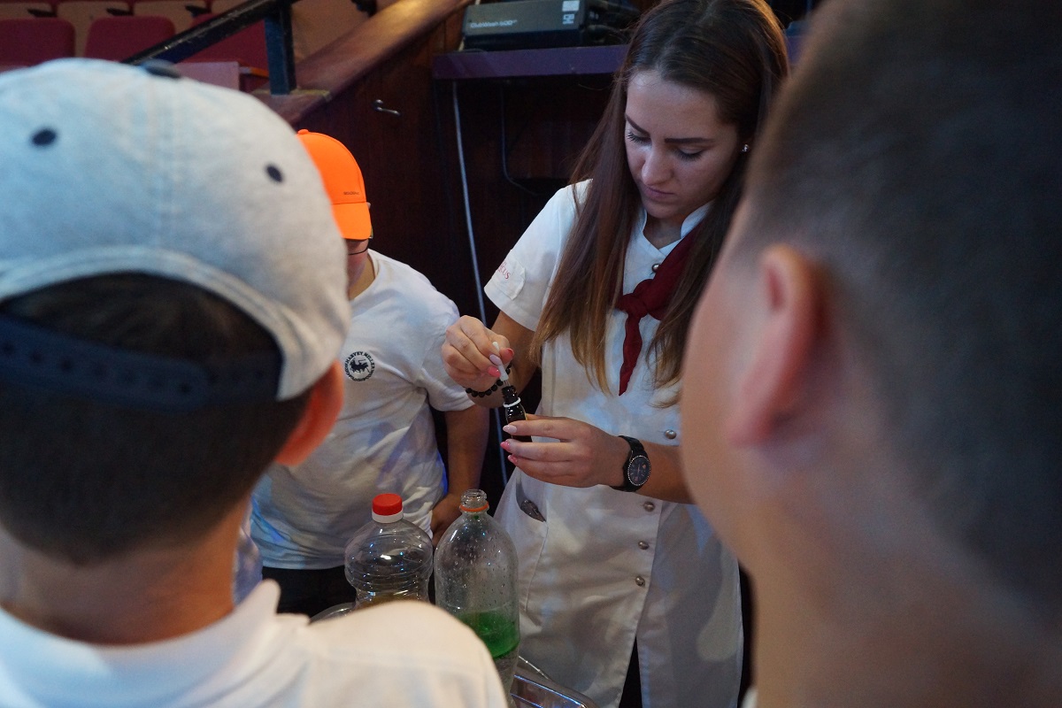 Az előadás után Boldizsár Gizi irányításával a gyermekek öt fős csoportokra oszolva, felügyelet mellett, a manézs négy bejáratánál felállított standoknál interaktív kísérletezésbe kezdtek. Az első standnál a víz, mint oldószer volt a téma: a nebulók papírlapra filctollal rajzolt színes pöttyeit a rájuk cseppentett víz elmosódottá tette.