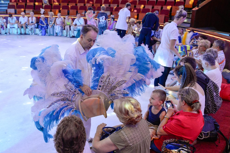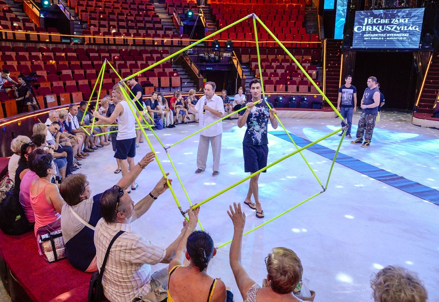 Délelőtt tíz órától Fekete Péter, a Fővárosi Nagycirkusz igazgatója és az Antarktisz gyermekei előadás artista sztárjai egyedülálló bemutatót tartottak a jégbe borult manézsban, a Vakok és Gyengénlátók Békés Megyei Egyesületének tagjai számára. Az izgalmas program keretében bemutatásra kerültek az előadásban használt rekvizitek, többek között kosztümök, egykerekű biciklik, buzogányok, diabolok, magasított gólyaláb korcsolyák és rönrádok. A manézs szélén helyet foglaló közönségnek minden eszközt egyesével megmutattak, és ki is próbálhatták őket. Fekete Péter átfogóan ismertette a műsorban bemutatott trükkök lényegét, a rekvizitek anyagát, formáját, méretét és használatát.
