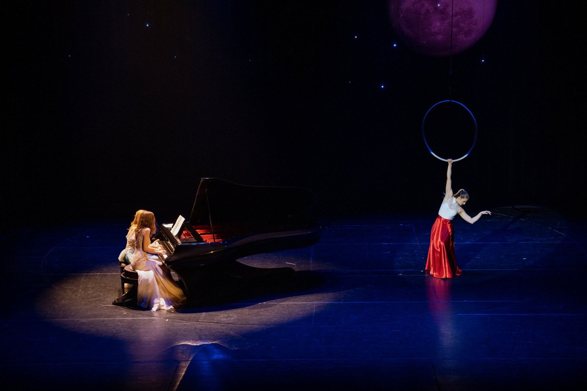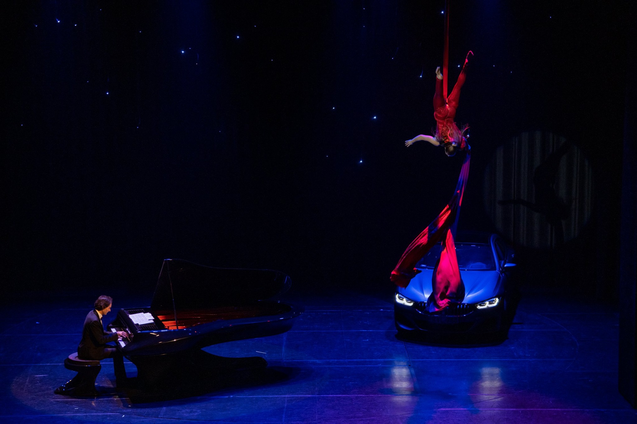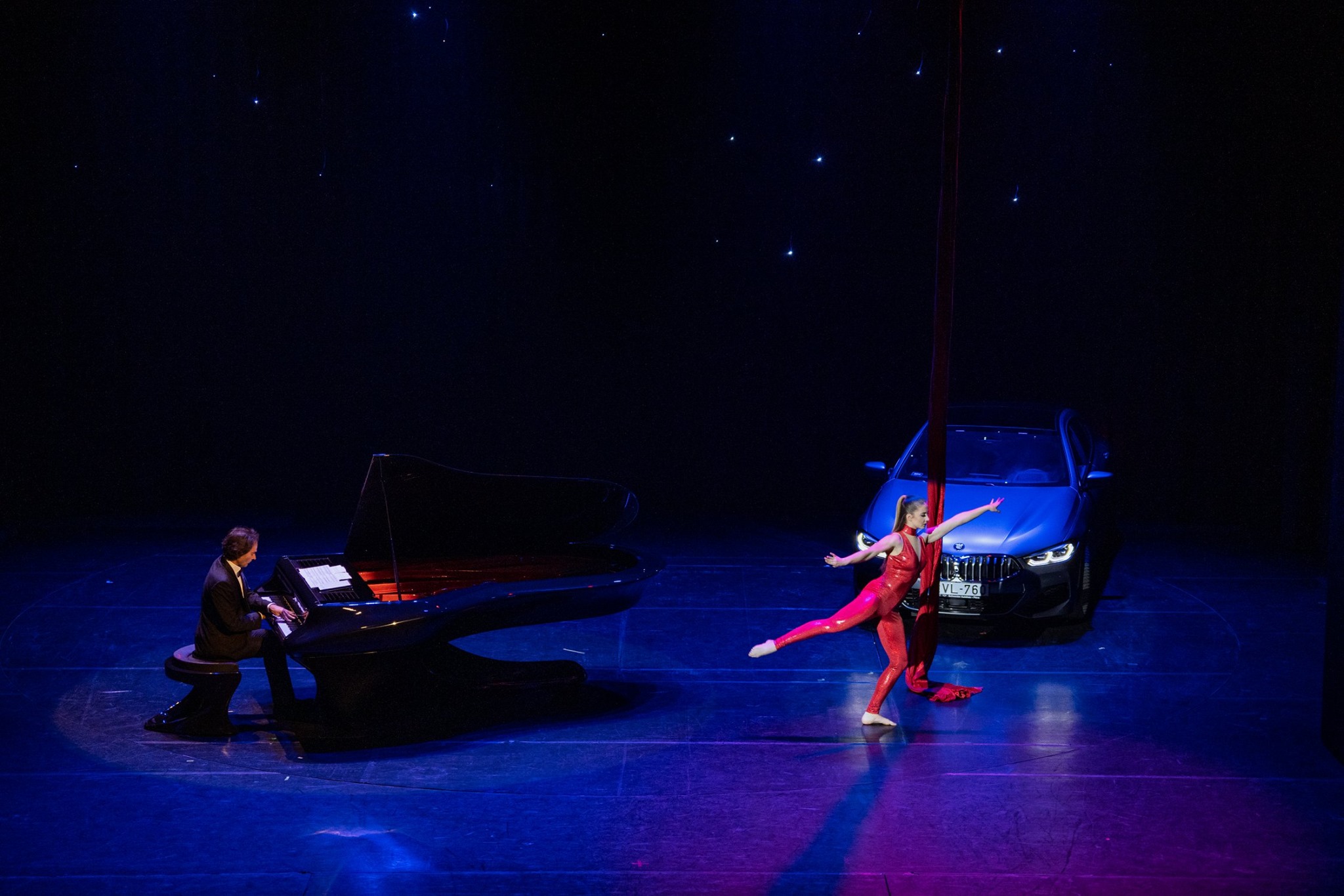 Ez a kép vezette fel az est legváratlanabb pillanatát: egy mattezüst BMW 8 Gran Coupé gördült elegáns lassúsággal a színpad jobb oldalára, majd kiszállt belőle Bogányi Gergely Kossuth- és Liszt Ferenc-díjas zongoraművész. Így sem kezdődött még zongorakoncert! Bogányi futurisztikusan gyönyörű, világhíres zongoráján nagy szenvedéllyel játszott, hogy koncertje egy váratlan és katartikus koreográfiával érjen véget. Liszt Ferenc Un sospiro című hangversenyetűdjére Vellai Krisztina mutatta be akrobatikus és tissue-koreográfiáját. Ami 2018 őszén a New York-i Metropolitan Opera színpadán mégsem valósult meg, az most a pár száz fős kaposvári közönség előtt megszületett: a világhíres zongorista és a kiugróan tehetséges fiatal légtornász találkozása karmikus volt: olyan összhangban rezonáltak egymás legkisebb rezdülésére is, mintha heteket-hónapokat gyakoroltak volna együtt a fellépés előtt.