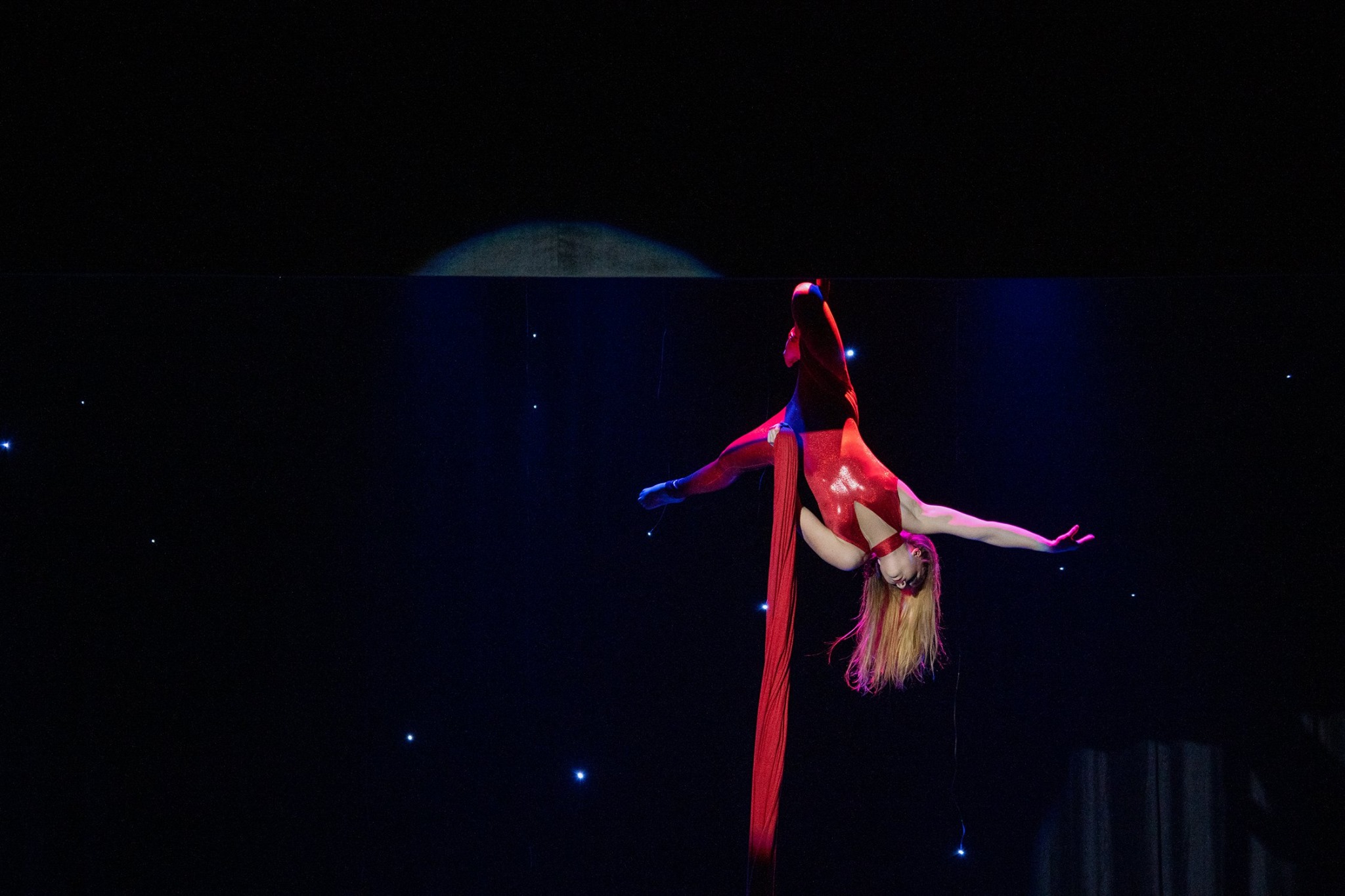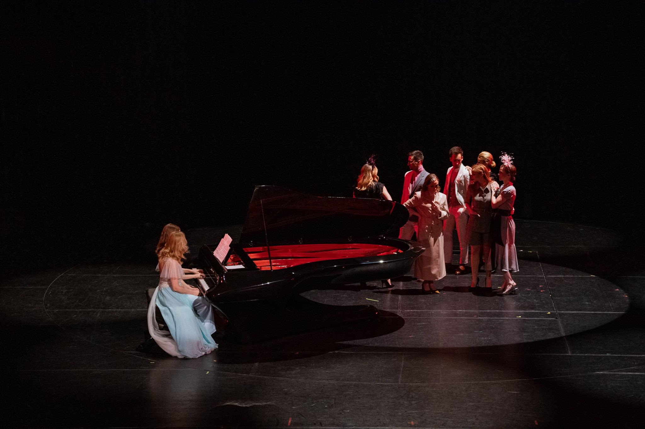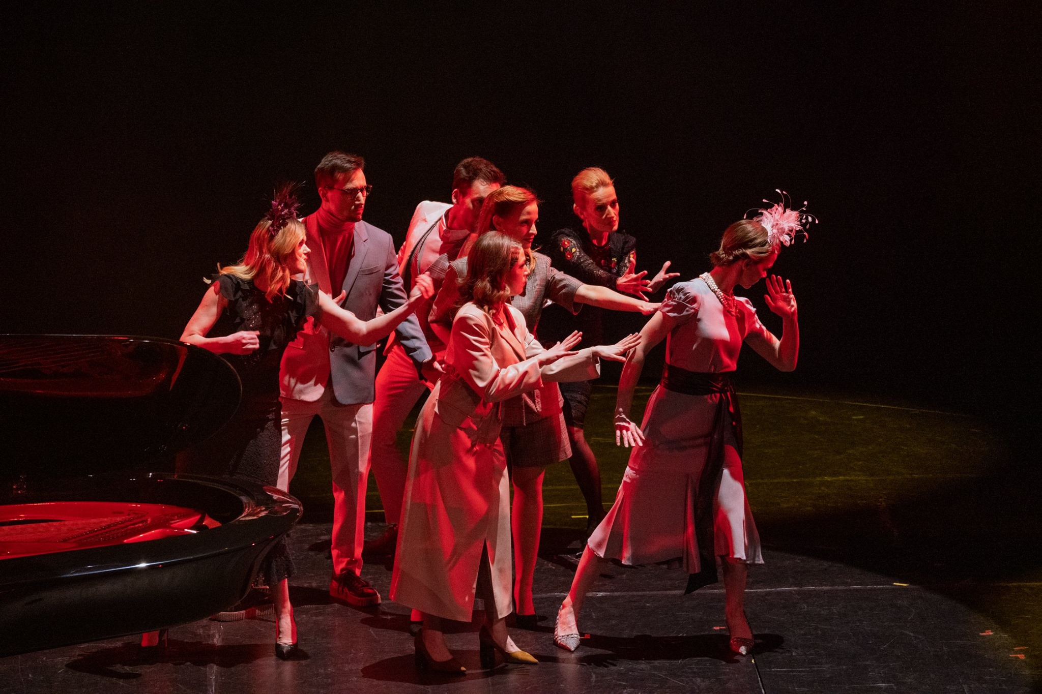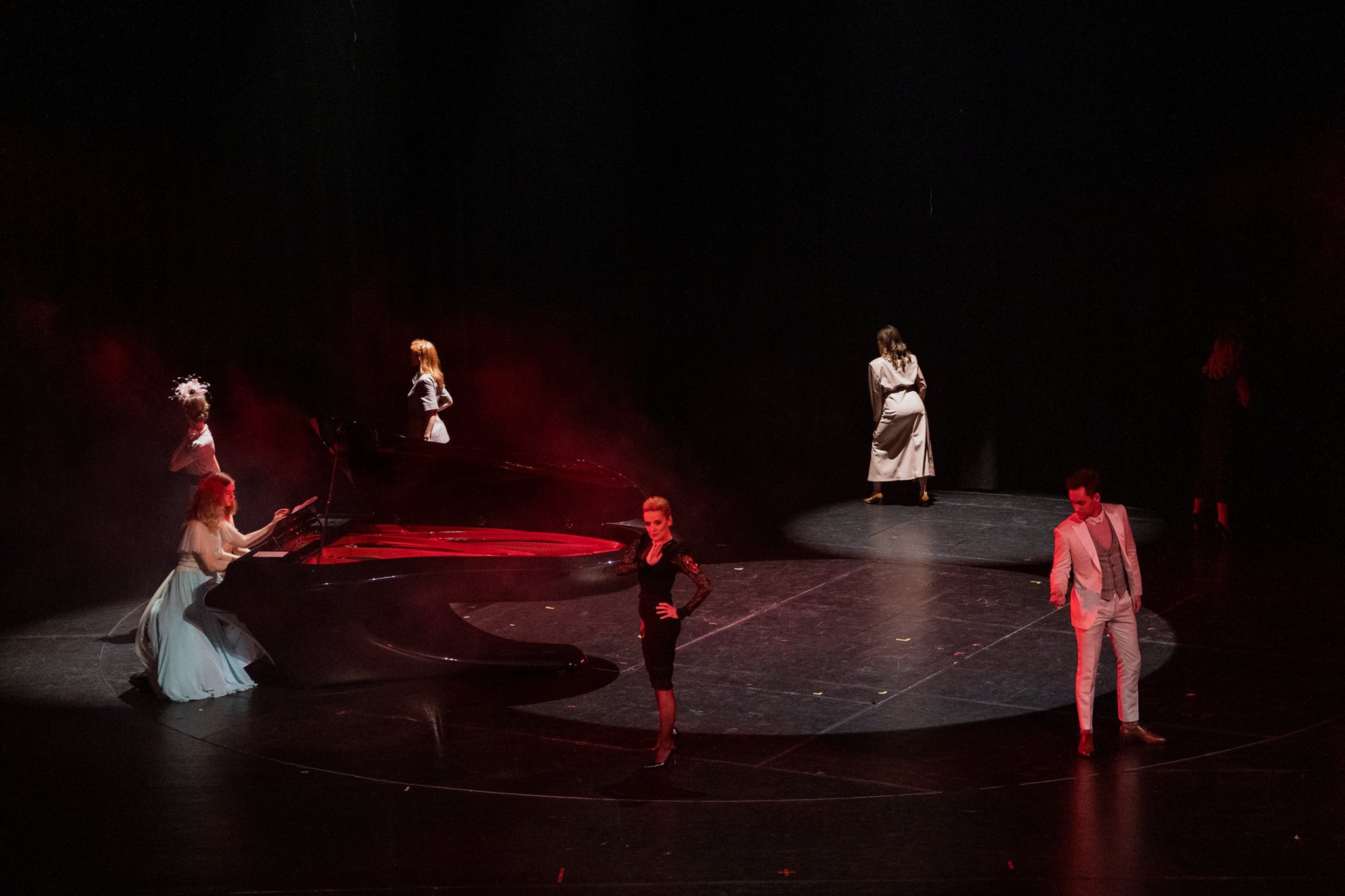 Az első jelenet a teliholdas, millió csillagos nyáréji égbolt alatt játszódott, Várnagy Andrea és lánya, Farkas Lili kísérte zongorán Takács Bence versmondását és Vellai Krisztina karikaszámát. A lírai hangulatból aztán könnyed eleganciával átlibbentünk egy igazán különös varázsvilágba: a minden irányba mozgó színpadon szupermodelleket játszó kaposvári színészek vonultak minden irányba, sokszor szinte optikailag egy helyben mozogva, ahogy a forgó színpaddal ellentétes irányba indultak, közben megmozdult a zongora is, és a vibráló fények és forgó zongorajáték akusztikai lüktetése teremtett egészen magába húzó hangulatot.