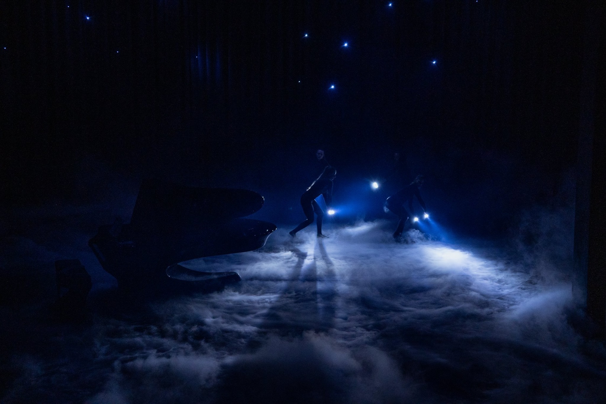 Ahogy a színpad forgása megállt, hajnali köd ereszkedett a tájra, és mint szentjánosbogarakkal marionettező lidércek, négy kecses alak kezdett fénnyel-sötéttel játszó, a hullámzó füsttel szimbiózisban mozgó tánckoreográfiába.