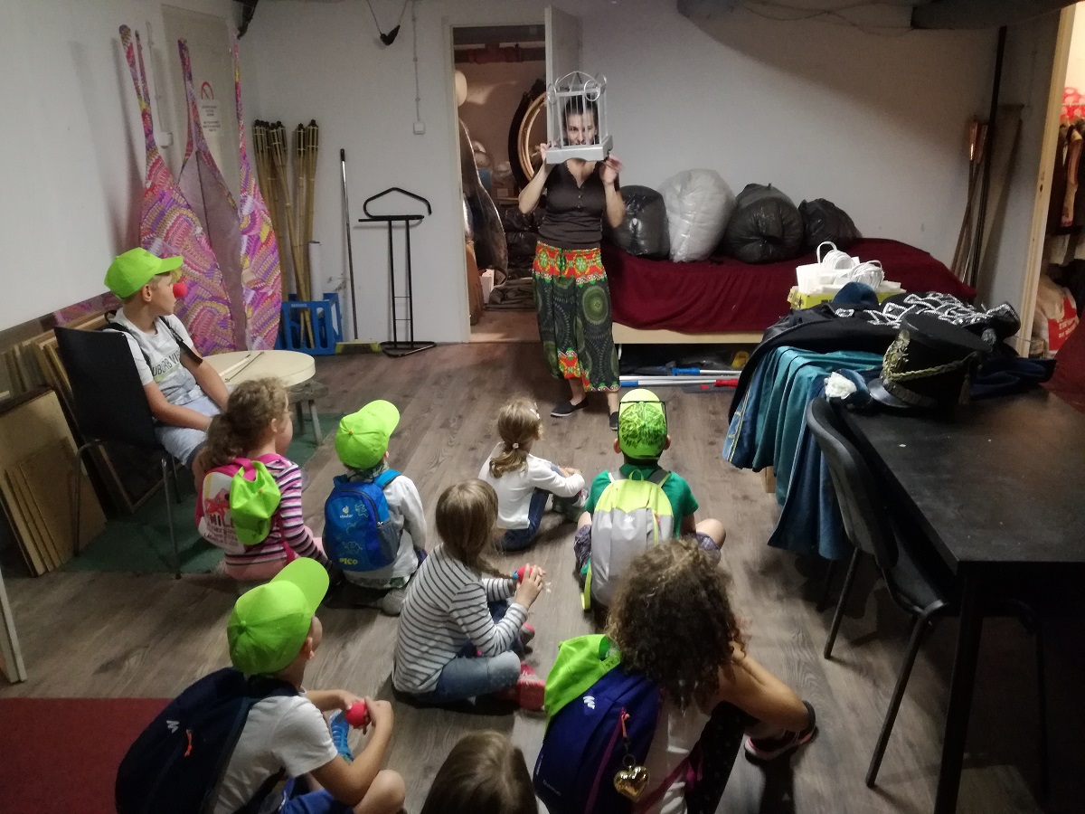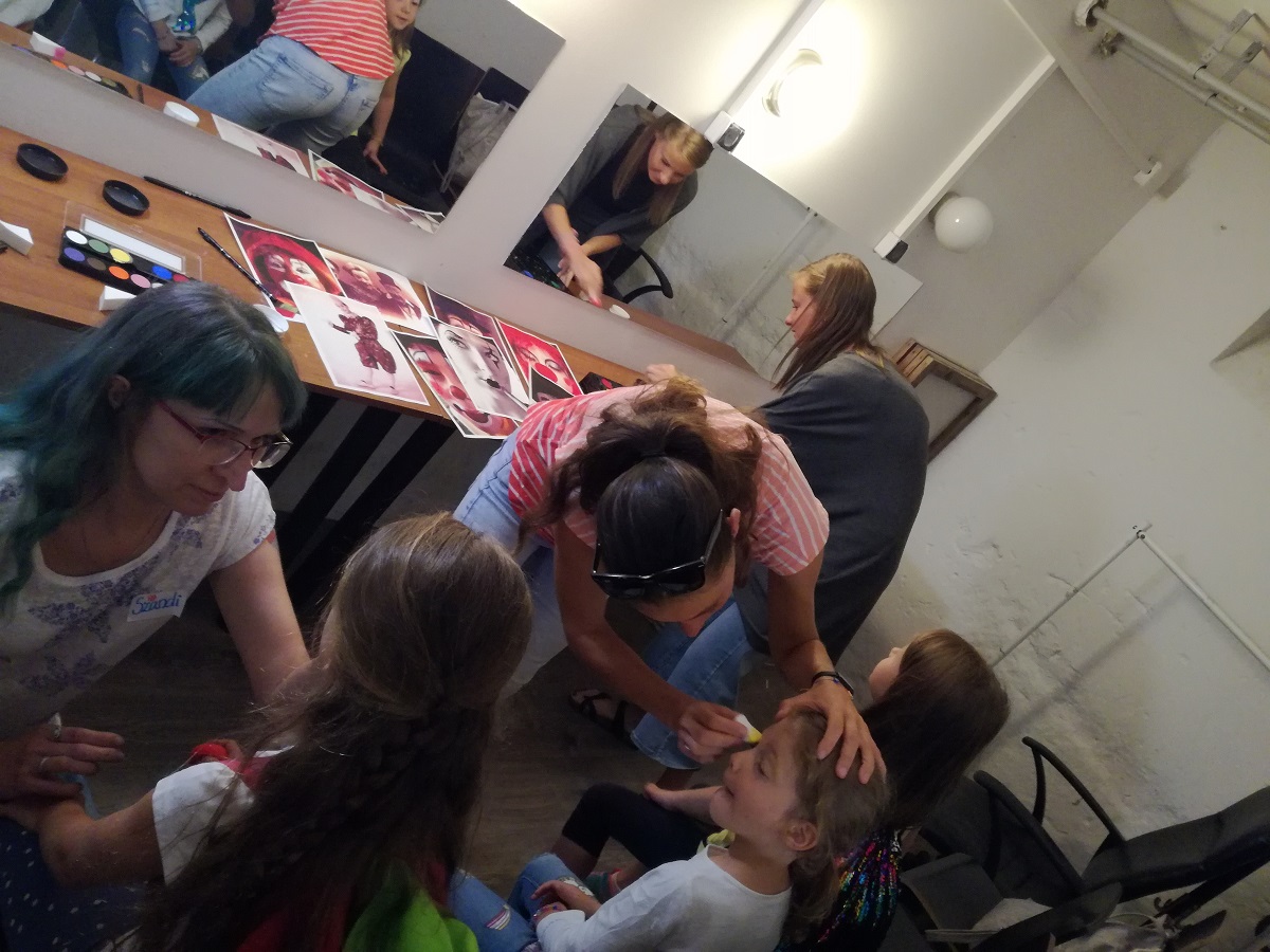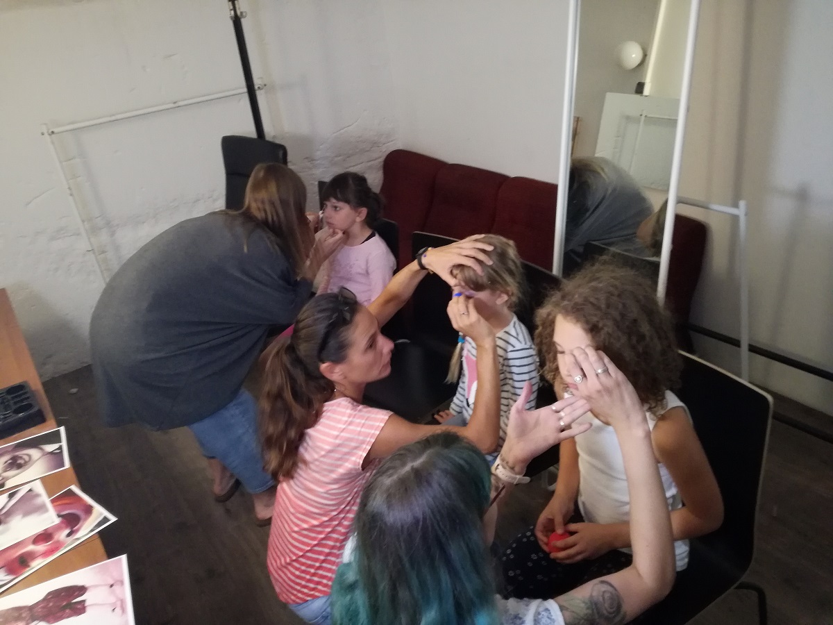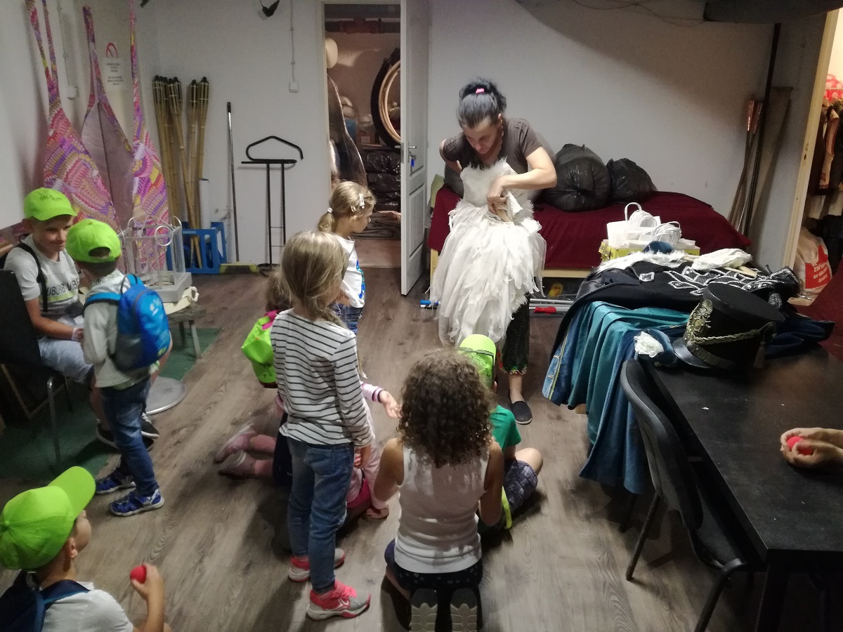 Azután a jelmeztárban Kis Judit jelmeztervező különleges kosztümöket mutatott nekik a Lúdas Matyi a cirkuszban előadásunkból, végül a vállalkozó kedvű gyerekeket valódi cirkuszi sminkkel ajándékoztuk meg.