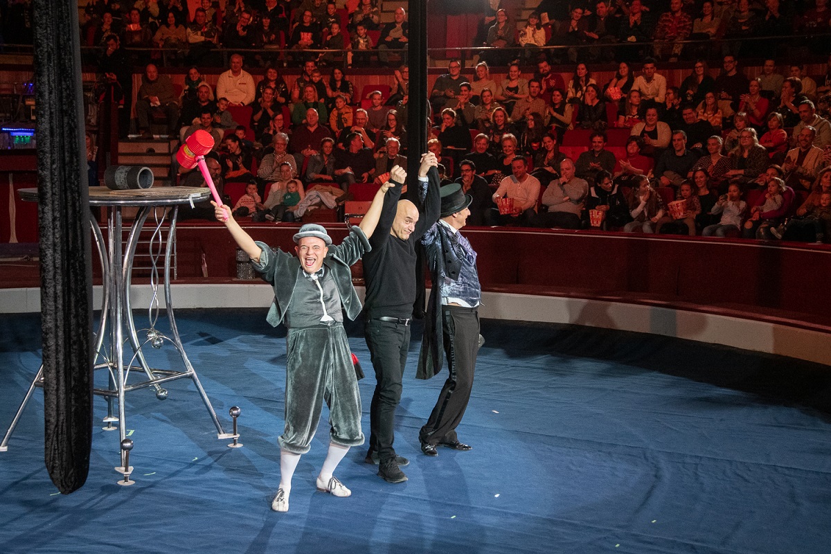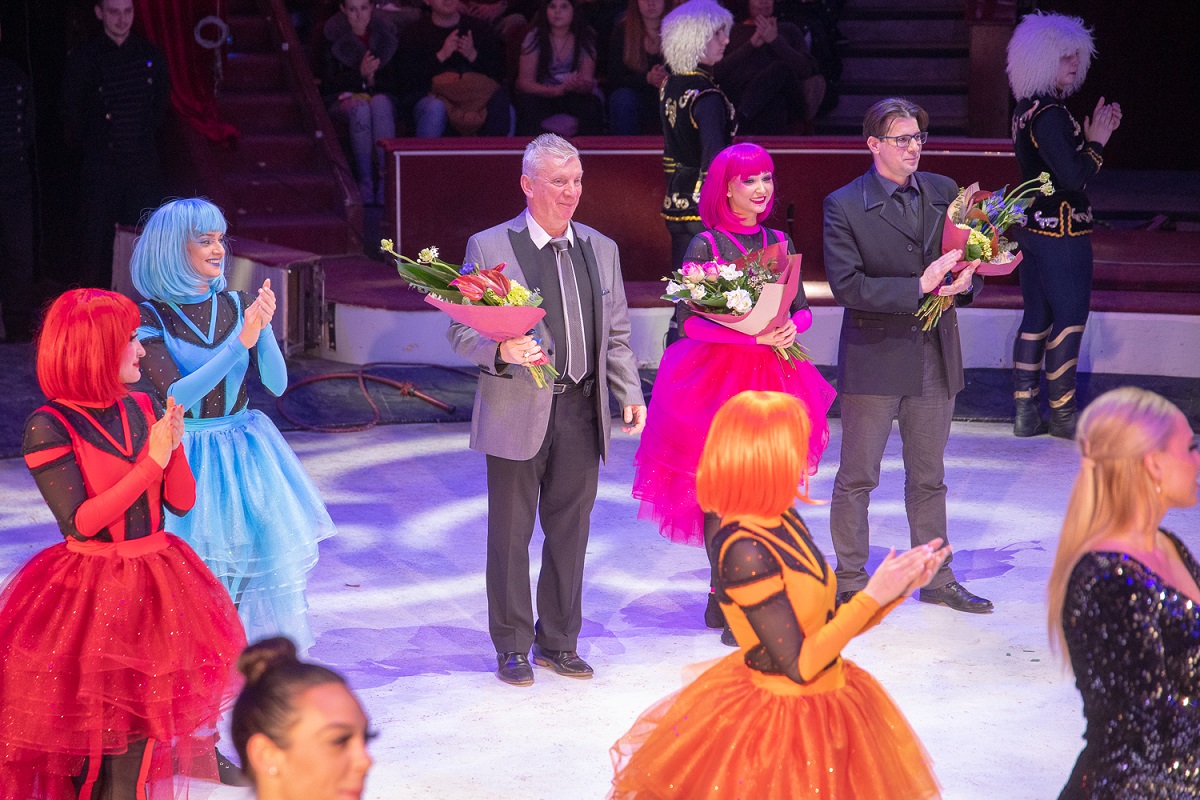 A vidám finálé után virággal köszöntötték Graeser Józsefet, a Fővárosi Nagycirkusz szakmai igazgatóját és az előadás rendezőjét, Pál Dániel Levente dramaturgot és Szabó Réka Zsófia koreográfust.