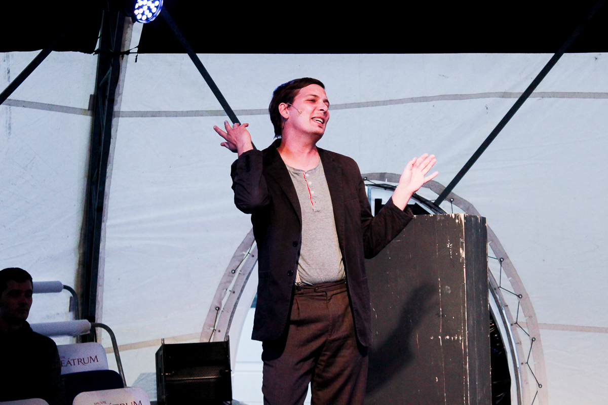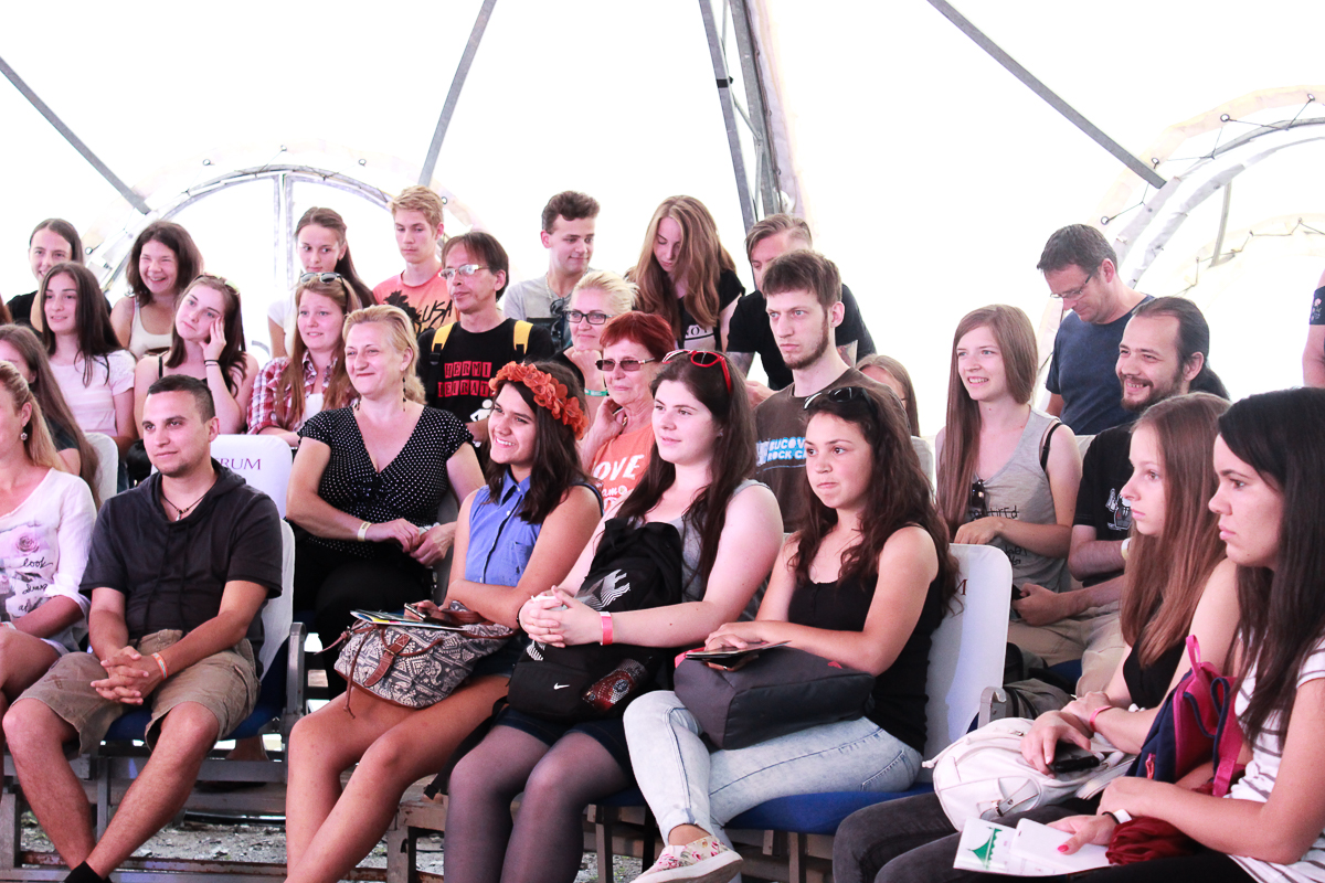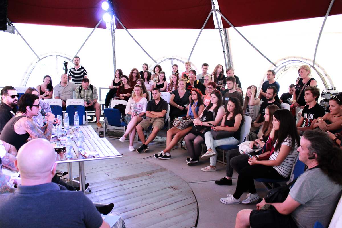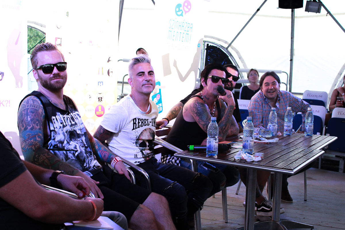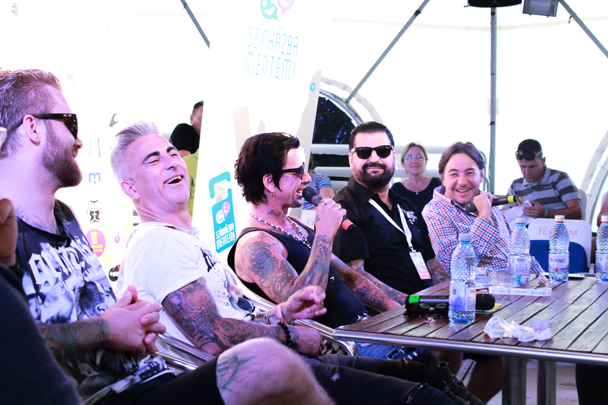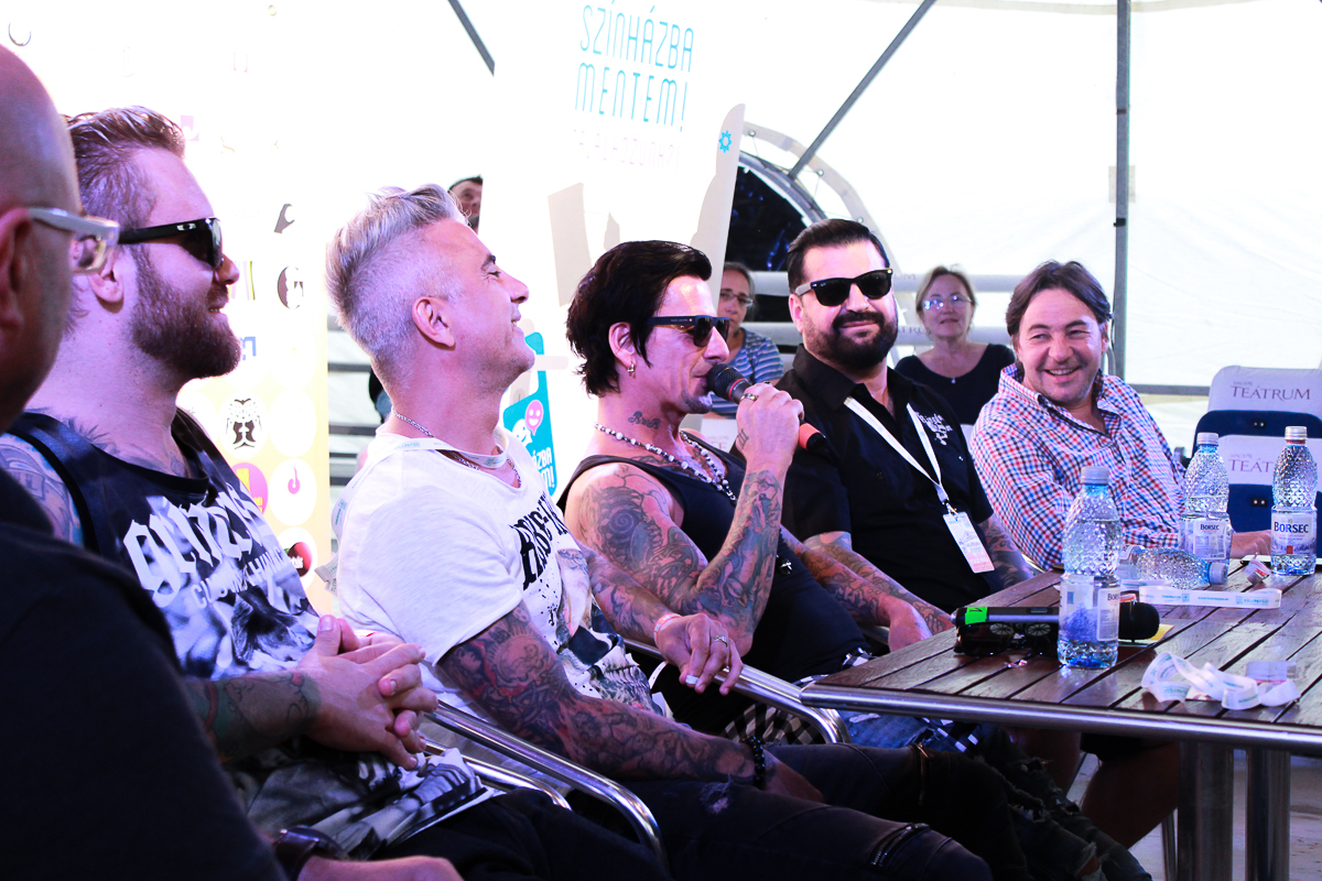 Délután a beszélgetéseké a főszerep, a rajongók minden nap találkozhatnak az aznap fellépő – igen nívós művészeti palettán mozgó – előadókkal. Nem történt ez máshogy az első nap nyitókoncertjét adó Hooligans tagjaival sem: a színházi sátorban a magyar funk&rock fenegyerekeivel beszélgetett Szabó László, a Magyar Teátrumi Társaság titkára, valamint a közönség. A baráti hangulatú diskurzus alatt – amelyen azért megnyugtatták a fiúkat, hogy ne aggódjanak, nem csak a lányok rajonganak értük – a már több mint húszéves zenekar tagjai, a magyar rock ikonjai, a kemény srácok hús-vér emberekké váltak, akik sokat tanítottak nekünk önazonosságról, hitről és szenvedélyről. Képzeljük csak el a 9 éves Endit (Kiss Endrét) és Tóth Tibit, ahogy szedett-vedett hangszereikkel – a dobok helyett vödrökkel – első koncertjükre tartanak a szerencsi művelődési házba, és tudják, ők soha mással nem foglalkoznak majd, nincs „B-terv”, a zene az életük.