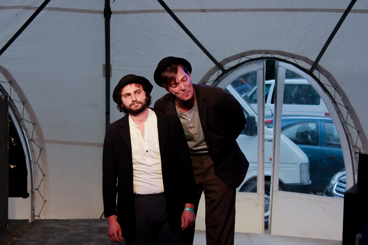 A közönségtalálkozót követően Marie Jones: Kövekkel a zsebében című tragikomédiáját mutatták be a Gyergyószentmiklósi Figura Stúdió Színház művészei. A humorral átszőtt, az álom és valóság közötti szakadékot boncolgató darabra megtelt a nézőtér, a szállingózó fesztiválozókat szinte beszippantotta a színházi varázslat. Nem is csoda, hiszen két remek színész – Kolozsi Borsos Gábor és Moşu Norbert László – összesen tizenhat szerepben brillírozott közel másfél órán keresztül a tönkrement videokölcsönző karakterétől a csóró munkanélkülin, a hisztis asszisztensen, az akcentus-specialista beszédtanáron vagy a helyi ír legényen át a sikeres amerikai mozisztárig.