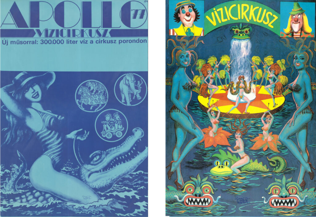 1976-ban a svéd Trolle Rodin vízicirkusz szerepelt a Fővárosi Nagycirkuszban, amelynek egyes műsorszámait a következő évben a hazai Apolló ’77 utazócirkusz vitte el az ország minden tájára. A Magyar Cirkusz és Varieté Vállalat (MACIVA) bevett gyakorlata volt, hogy a Fővárosi Nagycirkusz műsorát a vállalat utazócirkusza vitte turnéra, így a vidéki közönség is megcsodálhatta a nagyvolumenű műsorokat. „A száz cirkuszkocsival és 150 főnyi személyzettel rendelkező társulat hagyományos cirkuszi számokat és vízirevüt mutat be műsorában. Ez utóbbi céljára 300 ezer liter vizet tárolnak a porondon. A cirkusz programjában kiváló artisták lépnek fel, az állatprodukciókban lovagló bengáli tigriseket, krokodilokat, óriáskígyókat, játékos csimpánzokat láthat a közönség, s gyönyörködhet Lilla, a táncoló elefánt „művészetében” – írta a Hajdú-Bihari Napló 1977. április 23-án. A képeken az Apolló ’77 cirkusz plakátja, mellette a Főváros Nagycirkusz hasonló kiállítású „Vízicirkusz” műsorának plakátja 1982-ből, mindkettő Benkő Sándor grafikusművész alkotása.