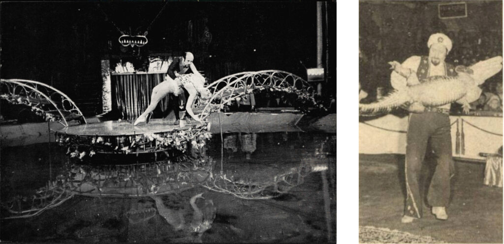 Mindkét műsor különlegessége az volt, hogy az első fele „szárazon” telt, míg a második részben egy hatalmas sárkányfejből mintegy 300 ezer liter víz árasztotta el a manézst. A vízzel teli porond közepén egy kis emelvényen mutatták be az artisták produkcióikat, ahogy az a fotón is látható: Sámson és Delila humoros táncduója a Fővárosi Nagycirkuszban 1976-ban. Mellette Matadzsi, azaz Schneller Károly egyik alligátorával – a fotót a Szolnok Megyei Néplap közölte le 1977. június 2-án a műsort beharangozó cikkében.